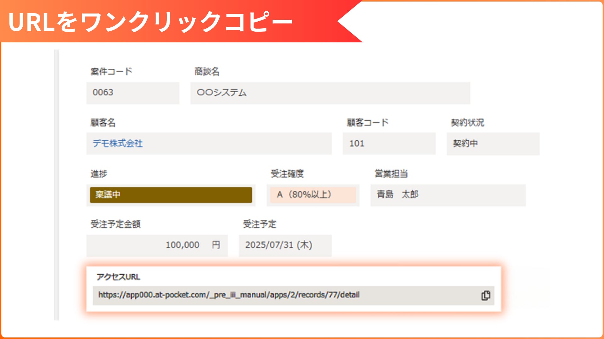 レコードに直接アクセスできるURLをワンクリックでコピーできるようになります。