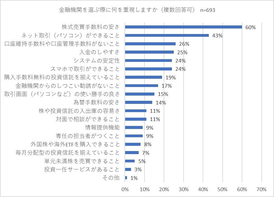 「金融機関を選ぶ際に何を重視しますか」との問いには「株式売買手数料の安さ」が60パーセントで2位以下を大きく引き離しトップとなりました。2位には「ネット取引(パソコン)ができること」(43パーセント)が入り、3位から6位までにはほぼ同じ割合で「口座維持手数料や口座管理手数料がないこと」(26パーセント)、「入金のしやすさ」(25パーセント)、「システムの安定性」(24パーセント)、「スマホで取引ができること」(24パーセント)が続きました。