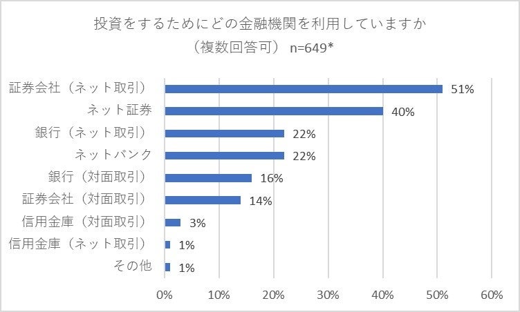 まず、「投資をするためにどの金融機関を利用していますか」*と質問したところ、上位4つの金融機関がいずれもネット取引であることが明らかになりました。トップは51パーセントの「証券会社(ネット取引)」、2位は40パーセントの「ネット証券」、3位は「銀行(ネット取引)」と「ネットバンク」が22パーセントで並びました。