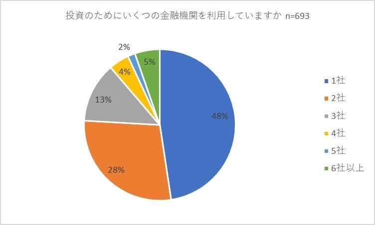 「投資のためにいくつの金融機関を利用していますか」との質問では「1社」が48パーセントで最多。以下、「2社」(28パーセント)、「3社」(13パーセント)が続きました。7割以上の大多数が1社あるいは2社を利用している結果となりました。