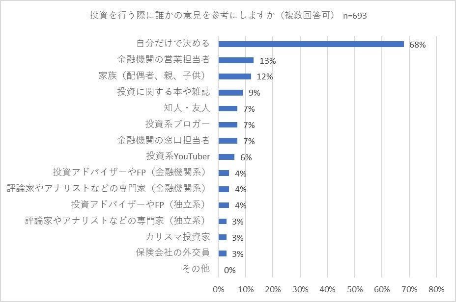投資を行う際の意思決定はどのように行っているのでしょうか。「投資を行う際に誰かの意見を参考にしますか」と質問したところ、「自分だけで決める」との回答が68パーセントと圧倒的多数を占めました。2位以下は「金融機関の営業担当者」(13パーセント)、「家族(配偶者、親、子供)」(12パーセント)、「投資に関する本や雑誌」(9パーセント)が続きました。