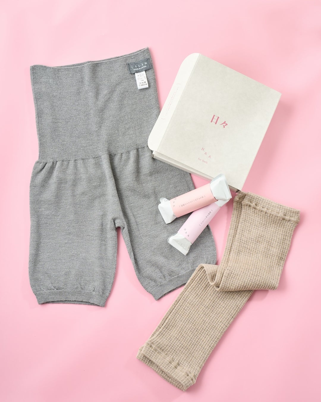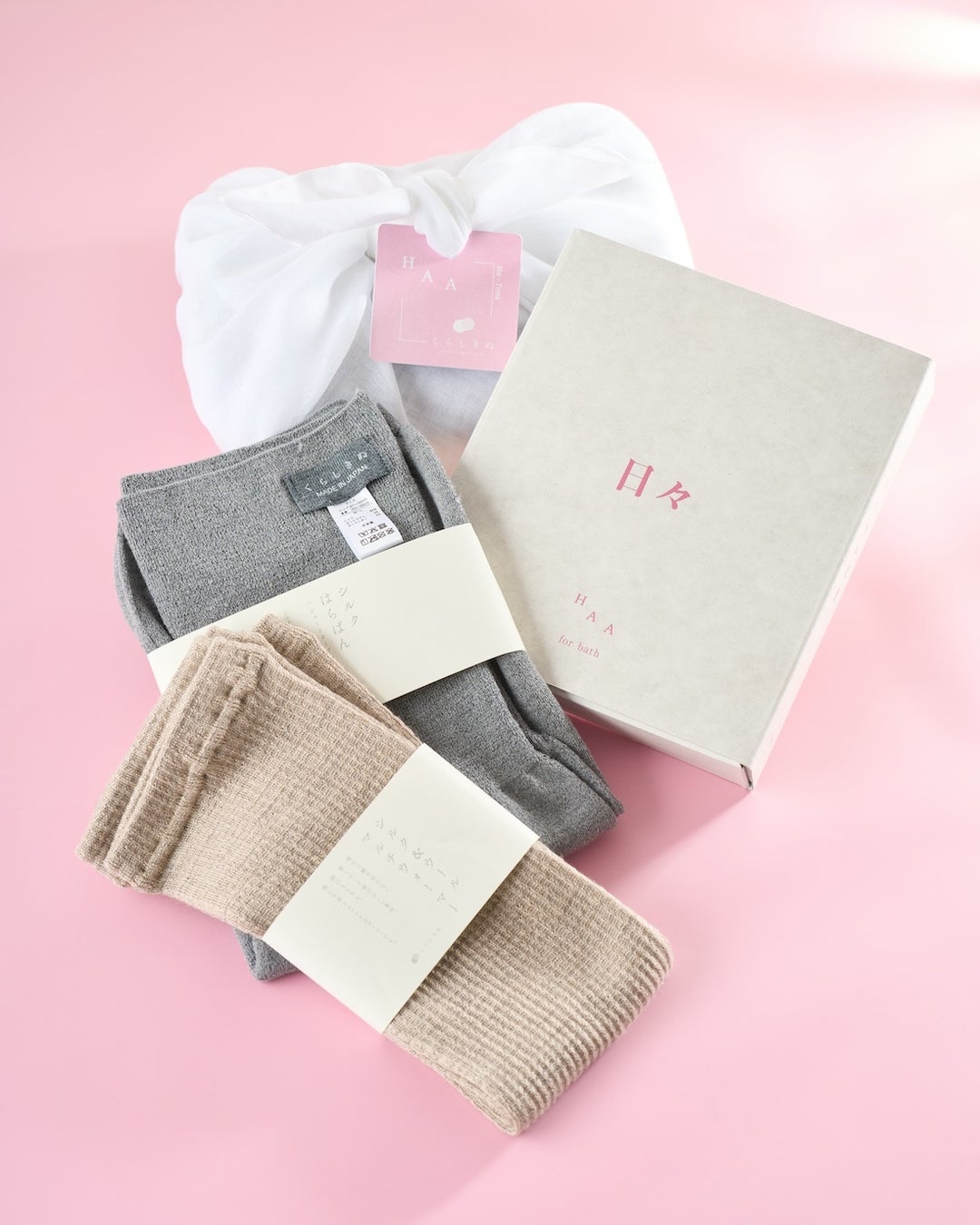 HAAの心温まるエッセイ付きの入浴剤「HAA for bath 日々 (5個) ギフトボックス ささやかな愛」と、くらしきぬの看板商品「シルク&ウールはらぱん ショートタイプ」を特別に染め上げた「蘇芳染めはらぱん ショートタイプ」を組み合わせました。