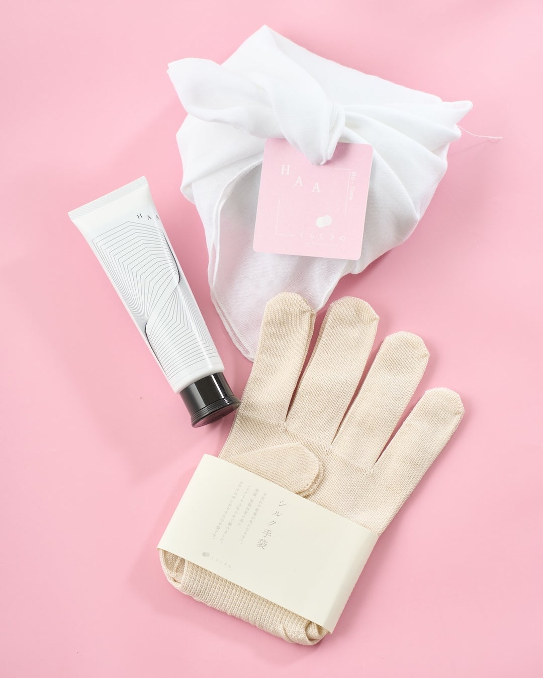 HAAの「HAA for rest 間の香(まのか)ハンドクリーム」と、くらしきぬの「シルク100%手袋」をセットにしました。