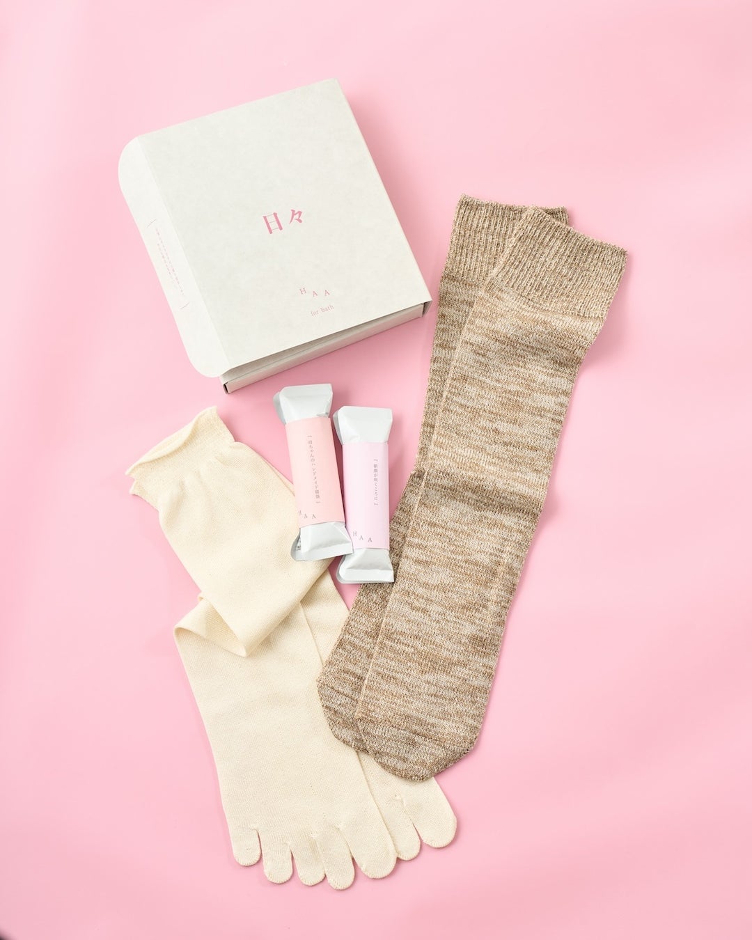 HAAの入浴剤「HAA for bath 日々 (5個) ギフトボックス ささやかな愛」と、くらしきぬの「お手軽冷えとり靴下 重ね履き2足セット」を組み合わせました。