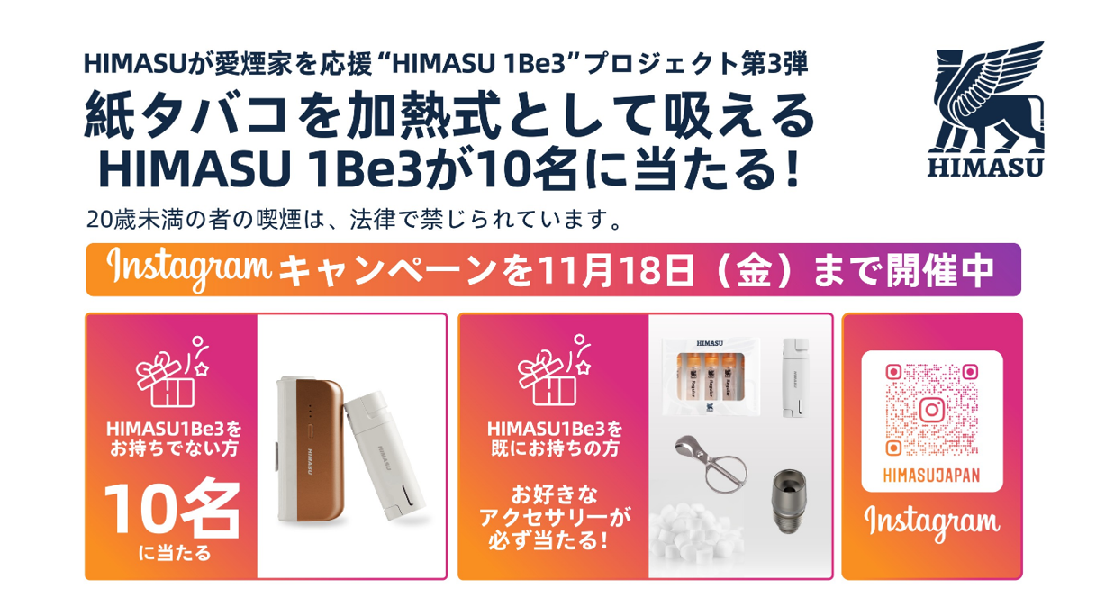 通常の紙タバコを加熱式として吸うことを可能にする新ジャンルのデバイスを展開する「Himasu(ヒマス)」(董希武、以下「Himasu」)は、 2022年10月のタバコ増税によりますます大きくなる喫煙者の経済的負担を支援することを目的に、『HIMASUが愛煙家を応援”SHIMASU”』プロジェクトを実施しております。今回はプロジェクトの第3弾として、 HIMASU1Be3が10名様に当たるキャンペーンと、既に製品をお持ちの方にはお好きなアイテムが必ず当たるキャンペーンを、インスタグラムの公式アカウントにて2022年10月18日(火)~11月18日(金)の期間中実施いたします。