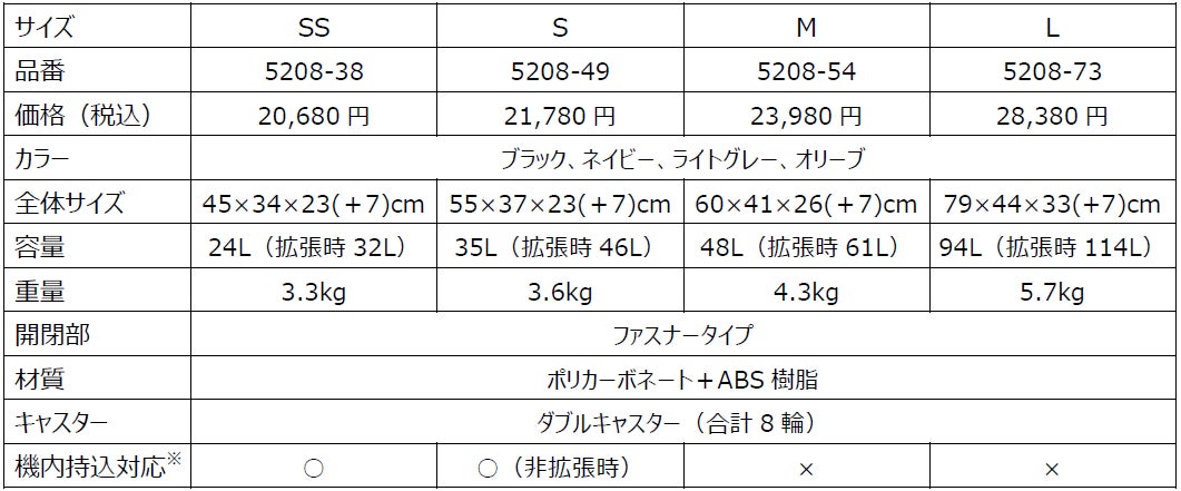 新色は「ライトグレー」と「オリーブ」、新サイズはコインロッカーサイズの「SSサイズ」と7泊以上向けの「Lサイズ」です。このたびの新色・新サイズの追加により、『MALIBU』は4色4サイズの展開となります。