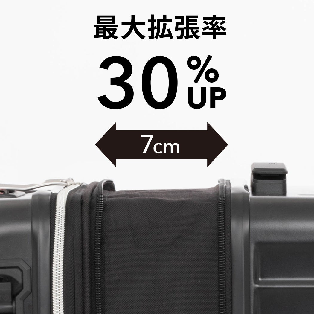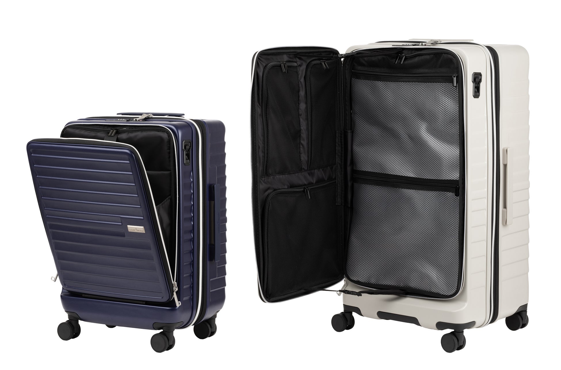 近年トレンドとなっているフロントオープンタイプで、SS・S・MサイズのフロントポケットにはノートPC等のデバイスを収納できるスペースを装備しているほか、業界最大級約7cmの容量拡張機能や、ワンタッチレバー式のストッパー、多段階キャリーバー、フック機能付き台座など、T&Sの特許や実用新案をはじめとする多くの機能を惜しみなく搭載。フロントだけでなく、真ん中からも開閉することができるので、パッキングから道中、目的地までのあらゆるシーンで、持ち運ぶものやその場に応じた使い分けをすることが可能です。