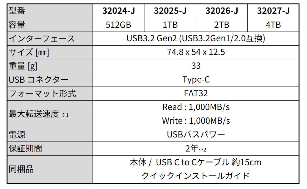 USB 3.2 Gen2インターフェースを搭載し、データ転送速度は読み出し最大1,000 MB/秒、書き込み最大1,000 MB/秒※と、大容量データの転送やビデオ編集、ゲームパフォーマンスの最大化にも最適です。 WindowsとMacの両方に対応しており、付属品としてUSB Type-C to Cケーブルを同梱しております。