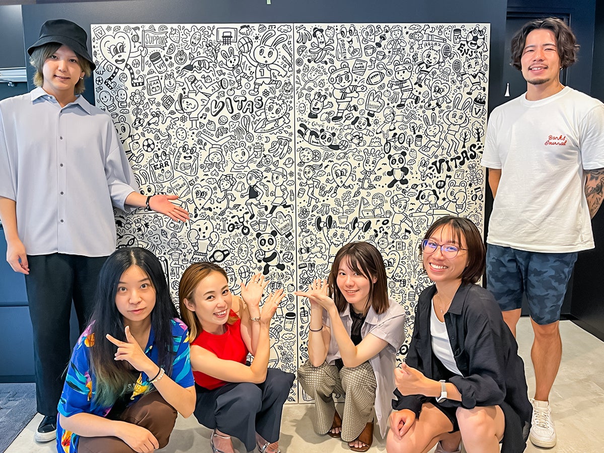 これから入社される求職者はもちろん、弊社オフィスにご来社いただく顧客の皆様にもVITASが持つ思い、ビジョンを発信するべく、国内外で活躍されるアーティスト「Chocomoo」さんにアート制作を依頼いたしました。