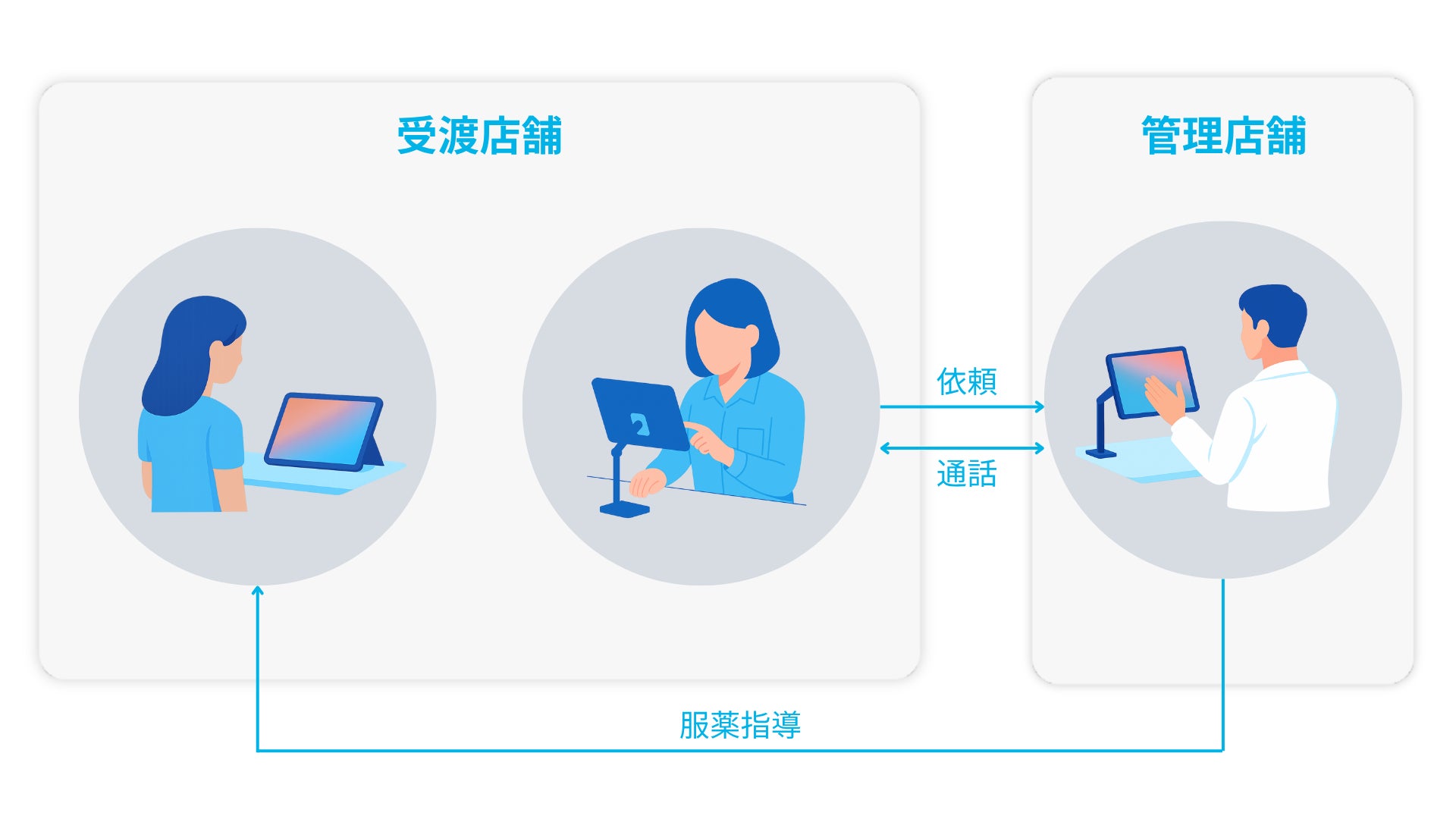 本機能により、来局した患者に対する服薬指導を、他店舗の薬剤師がリアルタイムのビデオ通話で実施できるようになり、薬局の人員不足や繁忙時の対応遅延を解消する仕組みが整いました。