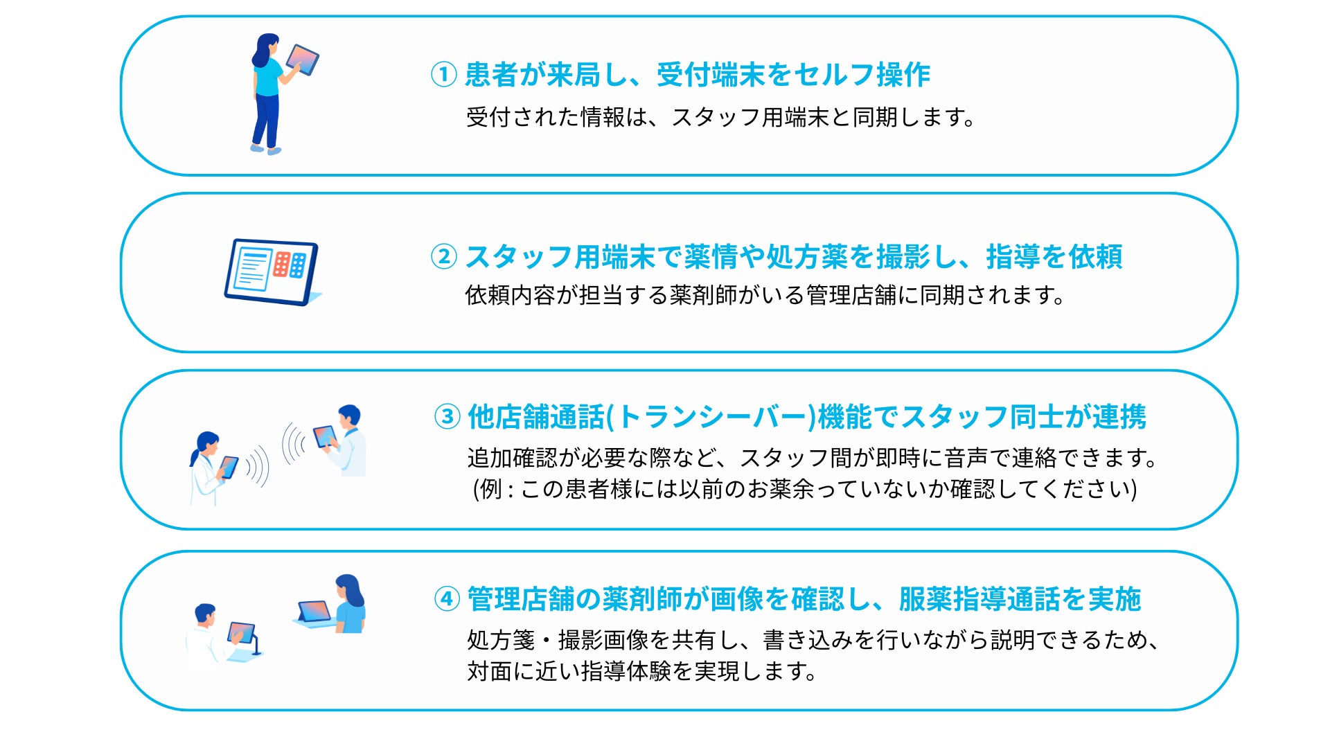 今回新たに加わった「LIVE服薬指導」により、店舗間をつないで薬剤師が服薬指導を行うことができ、来局した患者は、受渡店舗内に設置された端末から通話に参加して従来と同じ感覚で説明を受けることができます。