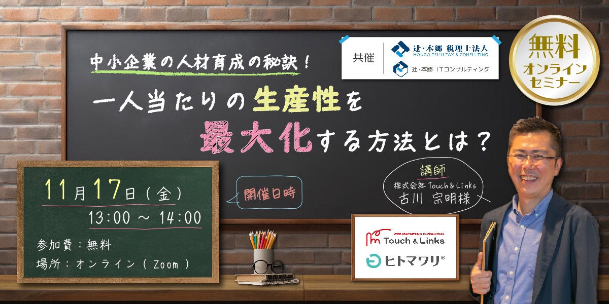 【11/17開催】無料セミナー「中小企業の人材育成の秘訣!一人当たりの生産性を最大化する方法とは?」辻・本郷 税理士法人/辻・本郷 ITコンサルティング株式会社(共催)