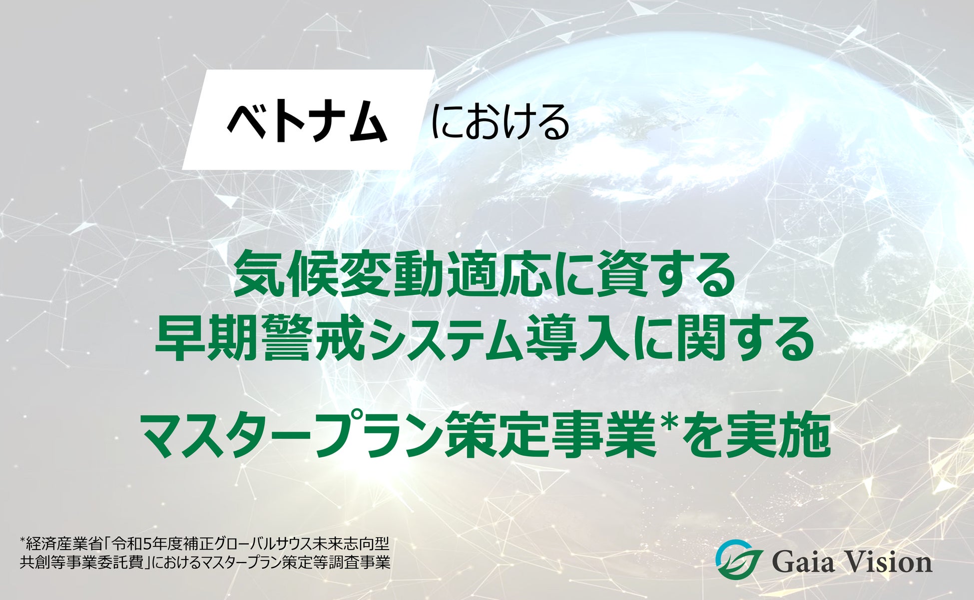 気候科学を専門とする東京大学発スタートアップの株式会社Gaia Vision(東京都渋谷区、代表取締役:北 祐樹、以下「Gaia Vision」)は、経済産業省からの委託事業(執行団体:ボストン コンサルティング グループ)として採択された事業「令和5年度補正グローバルサウス未来志向型共創等事業委託費」において、パシフィックコンサルタンツ株式会社、東京計器株式会社及び株式会社Specteeとともに提案した、ベトナムにおける早期警戒システム導入のマスタープラン策定等調査事業が採択されたことをお知らせいたします。