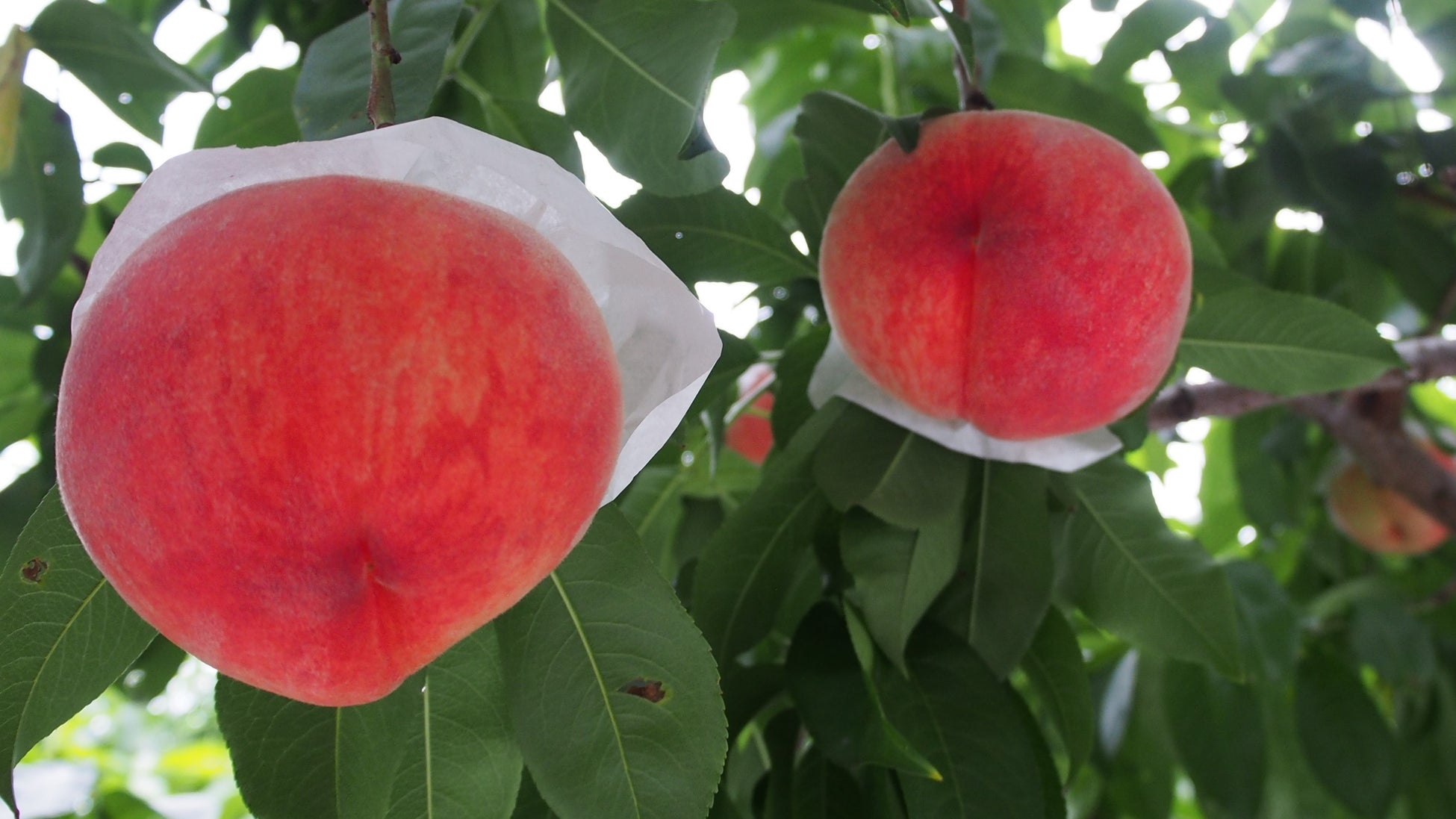 春日居エリアは甲府盆地のほぼ中央に位置し、奥秩父山塊から続く山並みが広がり、南東部の笛吹川沿いの平坦地からなります。桃の国内生産量1位の山梨県のなかでも※1、春日居の桃は山梨県の最高級ブランド。大玉で糖度が高く芳醇な香りの美しい桃です。