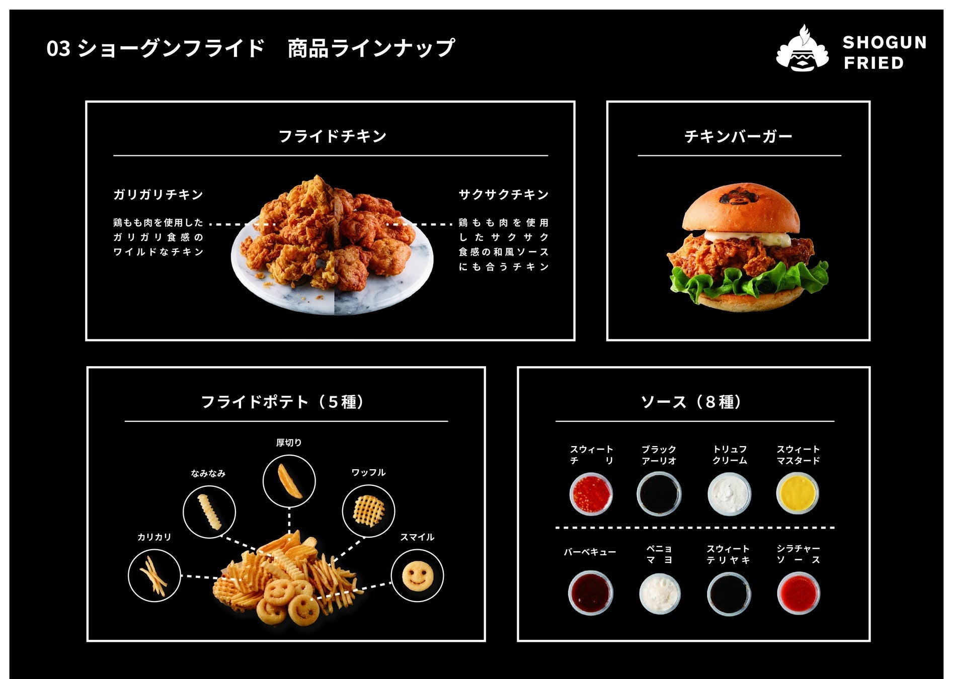先日Japan Burger Championshipで日本一を獲得し、今年11月には世界へ挑戦することが確定している「SHOGUN BURGER」ですが、そちらのメインシェフを務める扇谷が1000回以上の試作を行い、 試行錯誤をして出来上がった本格フライドチキンとポテトの専門店です。 “素材を活かす揚げ方”にとことんこだわっているので、揚げの食感が選べる新しいフライドチキンとポテトをご提供いたします。 サクサクとガリガリのチキン2種に、カットの異なるポテト5種、選べるソース8種の組み合わせは、全部で80種類以上の組み合わせが可能です。