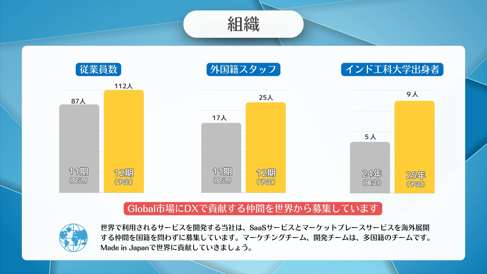 また、これまでもインド工科大を中心に新卒採用を行っていますが、今後は採用人数を大幅に増やしていく計画です。海外の優秀なエンジニアを採用して、AI事業とグローバル事業を推進していきます。それにより、海外売上を現状の15%ほどから、3年後に50%まで拡大することを目指してまいります。