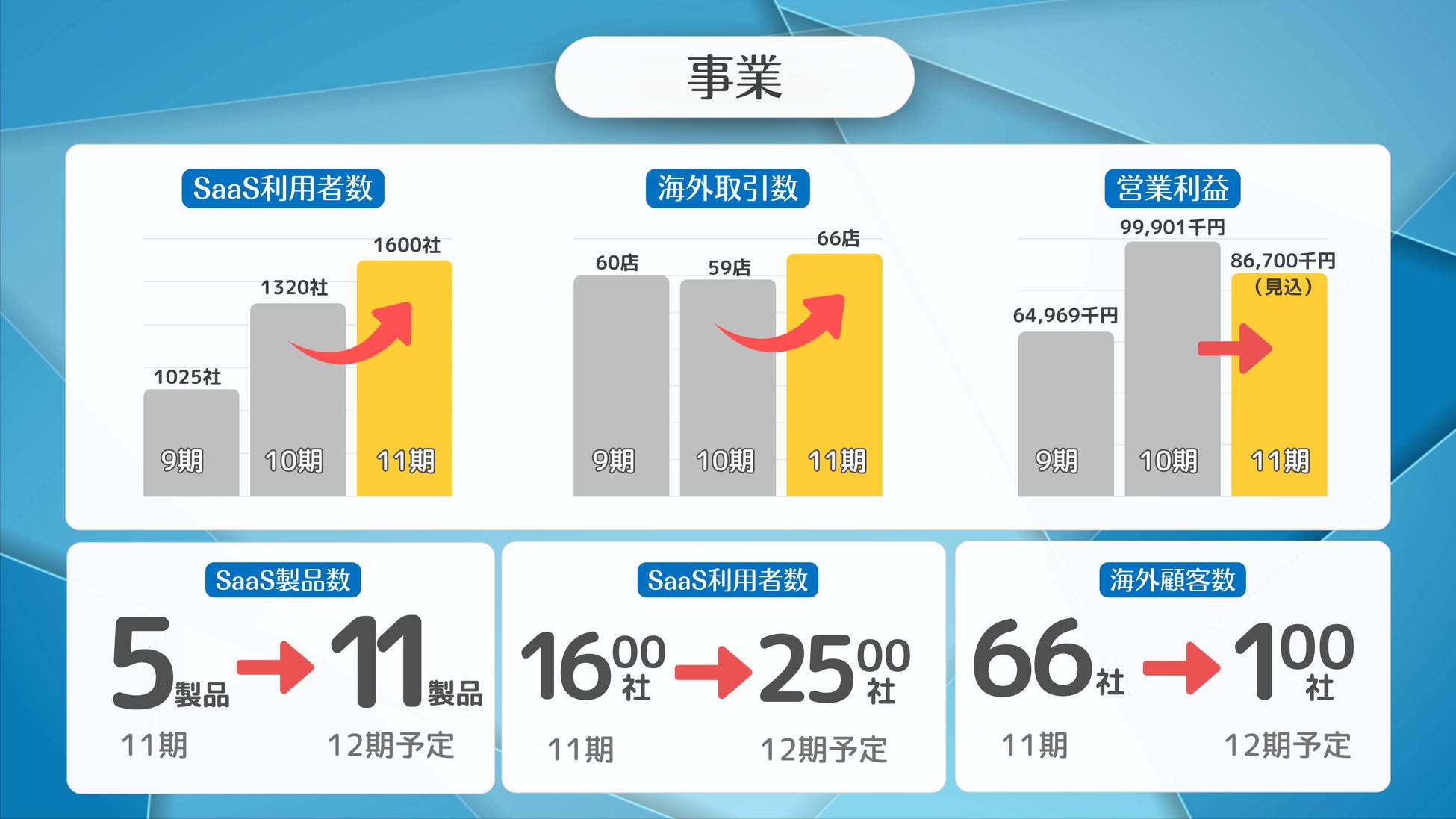 当社はSaaS事業を主たる事業としていますが、成長戦略として、コンパウンド化戦略を中心に多数の製品群を短期間に開発する予定です。それにより、大手企業やB2B企業、メーカー、海外企業などに顧客を拡大させて参ります。また、インド、ベトナムでのオフショア開発を強化して、海外市場向けのSaaS製品の開発も推進する予定です。新規事業として、インド工科大出身のエンジニアとインドラボを活用して、クロスボーダー型のAI事業などを計画しています。