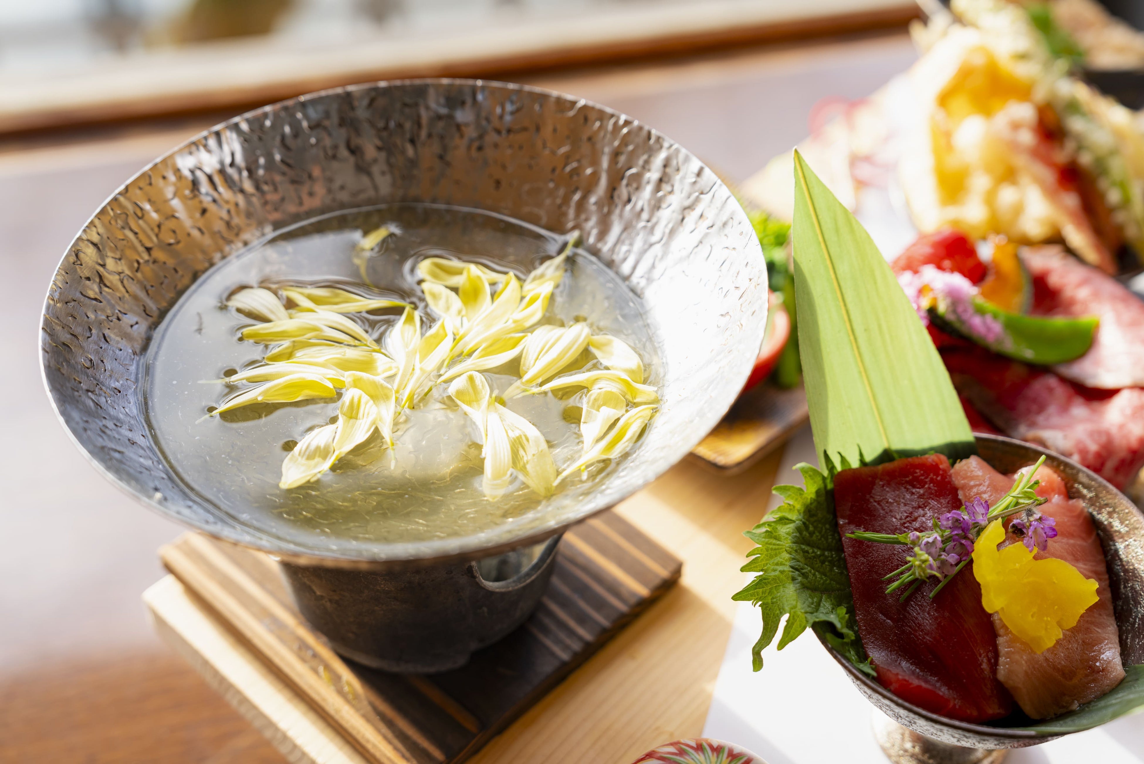 京都産絹豆腐とともに、春の味覚を自家製のお出汁でお召し上がりください。