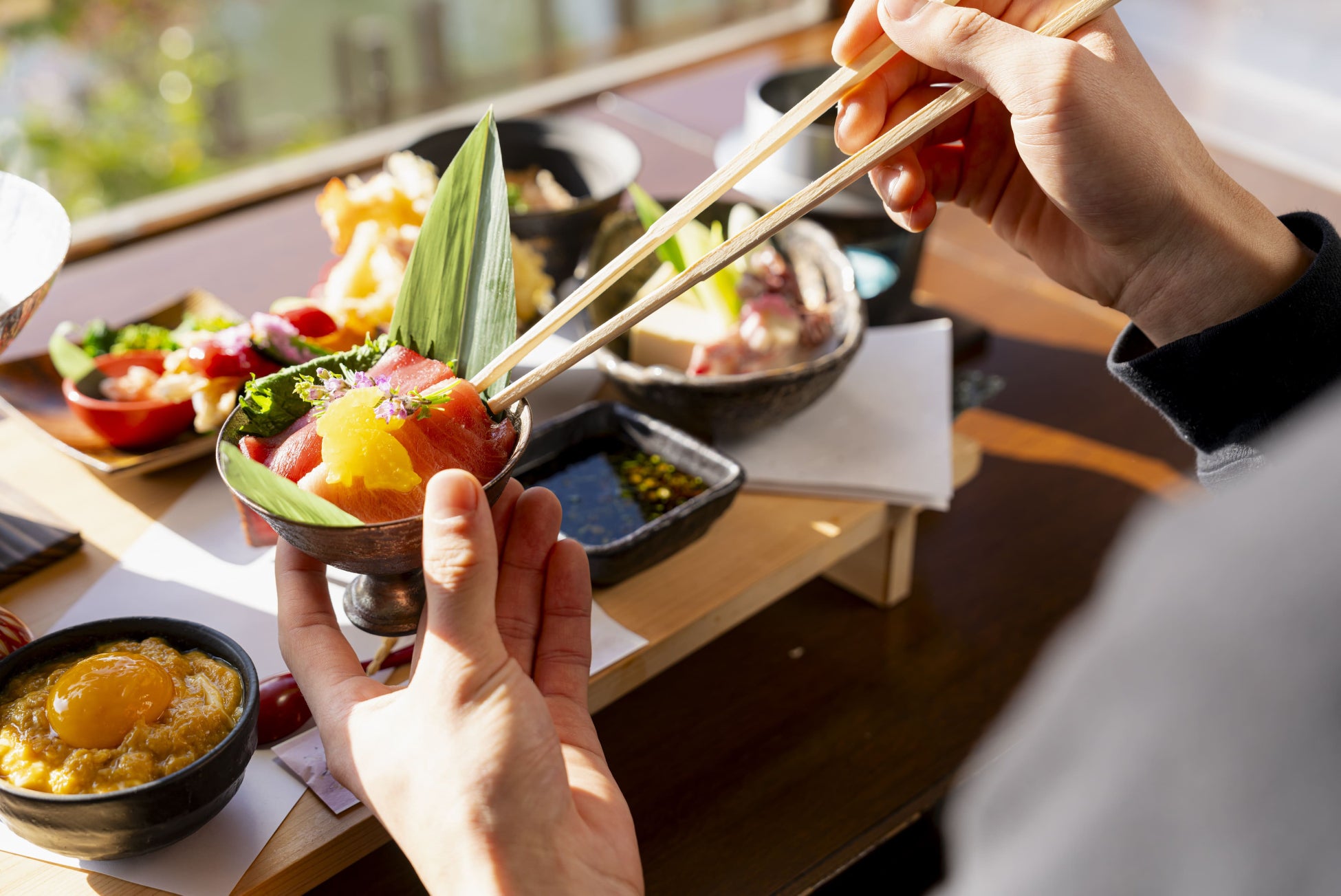 五木茶屋 嵐山本店では新鮮な食材の持つ香りや味わい、料理の盛り付けなど、五感で体験する新たな丼をお召し上がりいただけます。家族や恋人との旅行にもオススメできる体験型のお店です。