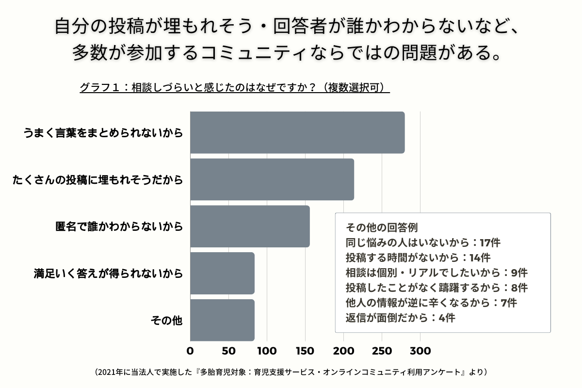 大きなコミュニティに成長したことで、オンラインコミュニティ事業から新たに見えてきた課題があります。それは、ひとりひとりの多胎ママの現状や課題、悩みや困りごとに合わせ、適切な支援につなげる必要がある、ということです。