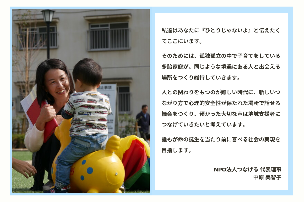 NPO法人つなげるは、双子や三つ子などを育てる多胎児家庭に対象を絞り、『多胎ママが支援を得て、健康で自律的に育児ができるためのエコシステムの実現』を当法人自体の最終成果に置き、不安や孤独を感じやすいという課題を解決するために、多胎ママがつながりあうためのオンラインコミュニティなどを運営しています。