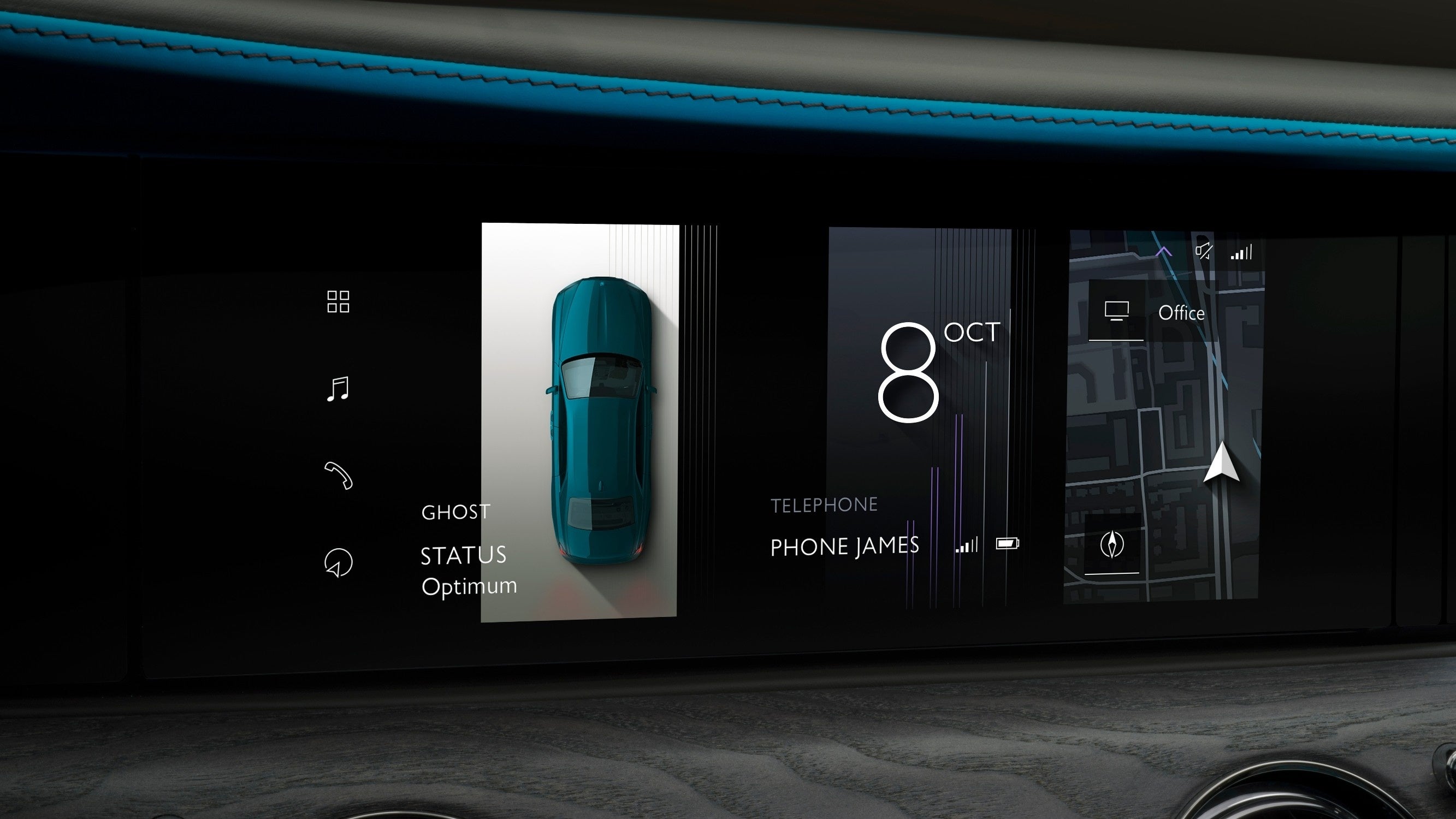 ゴースト・シリーズ IIでは、エンターテインメントおよびコネクティビティも大幅にアップグレードされています。後部座席のリア・スクリーンには、最大2台のストリーミング・デバイスを接続し、それぞれのスクリーンで独立してエンターテイメントを選択することができます。このインターフェースでは、マッサージ、冷暖房などのシート機能も管理することができます。あらゆるタイプのBluetooth®ヘッドフォンを後部座席のインフォテインメント・システムとペアリングすることができるほか、センター・コンソールに控えめに配されたUSB-C®充電ポートや、アップグレードされたWi-Fi®ホットスポットを利用することができます。