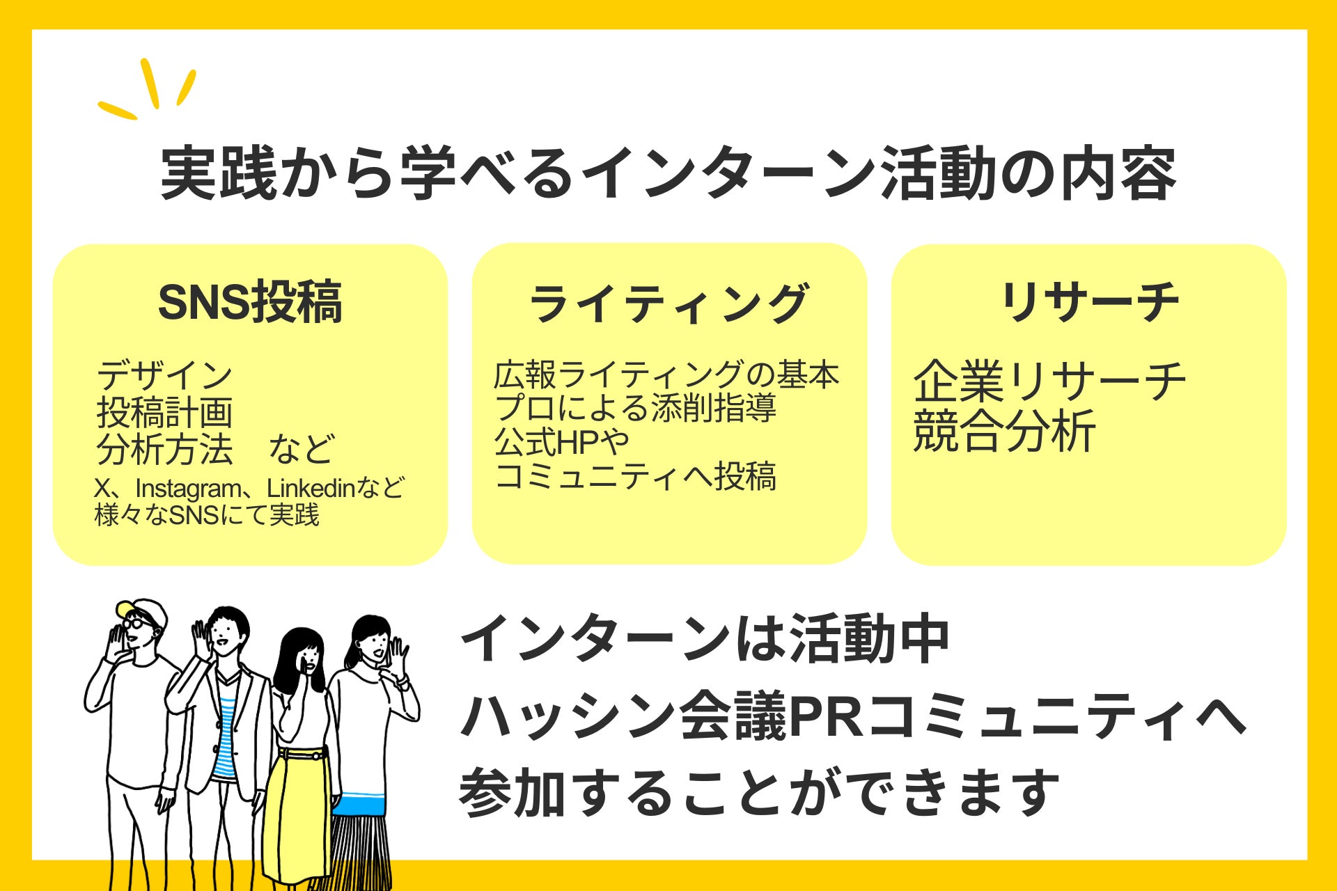 株式会社ハッシン会議(本社:東京都港区、代表取締役 井上千絵、以下当社)は、駐在キャリア支援サービスのCAREER MARK(運営元:株式会社ノヴィータ、東京都渋谷区)との共同プロジェクトとして、インターン活動の場を提供しています。2025年10月より、第8期となる『ハッシン会議インターン』がスタートしたことをお知らせします。このようなインターン活動を通じて、『広報スキル』を身につけ、自らキャリアを開拓していく自信につながる機会を提供できれば幸いです。