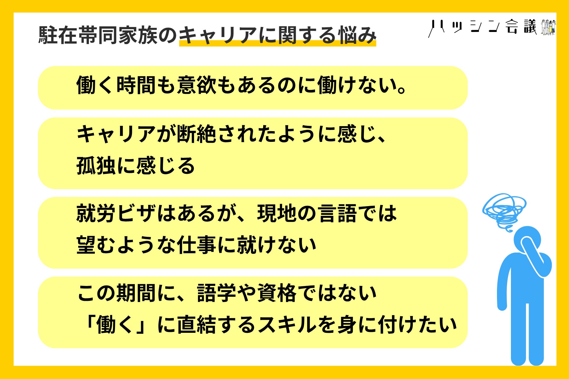 しかし、多くの地域で駐在帯同者の就労ビザを取ることは難しい状況です。また慣れない地での生活に適応するほうが優先度としては高くなってしまい、オンラインワークの継続も難しい状況にあります。ハッシン会議では、こうした状況を鑑みて、自分の生活スタイルを維持しながらオンラインで参加できるインターン活動を提供してきました。