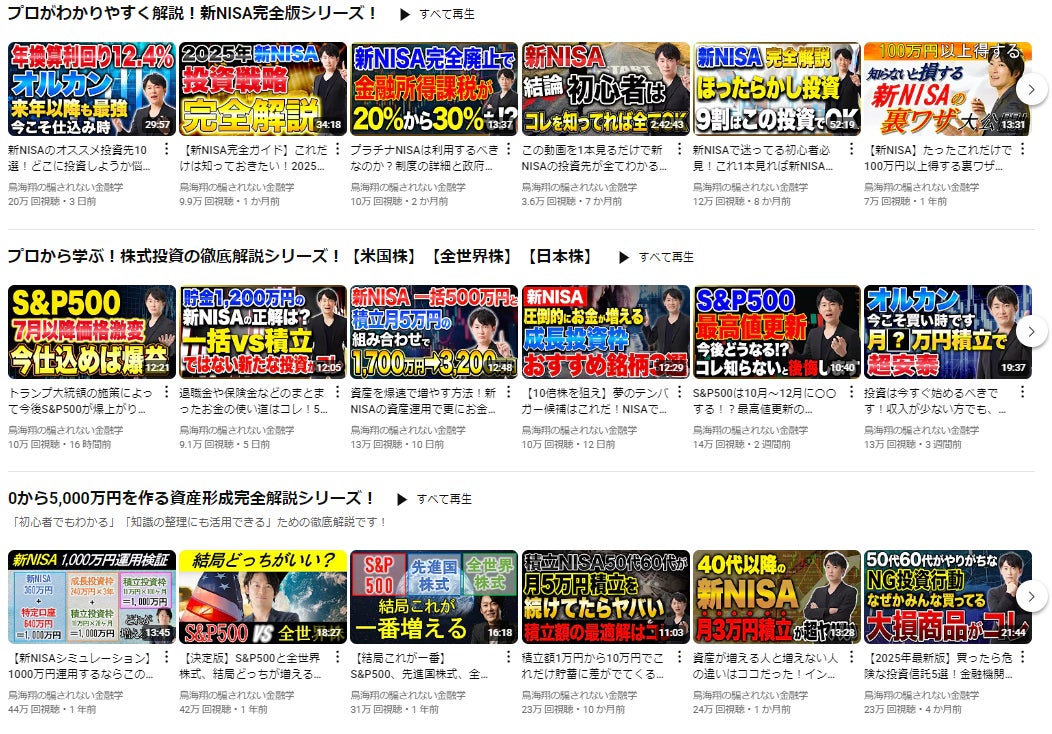 投稿動画は591本以上(2025年8月時点)。総再生回数は6,200万回を超え、多くの視聴者の学びと行動につながるチャンネルとして成長を続けてきました。特に、40〜60代のいわゆる「ミドルシニア世代」からの支持が厚く、「退職を前に不安がある」「老後の資産形成に向けて何をすべきか知りたい」といった課題意識に応える内容が高く評価されています。