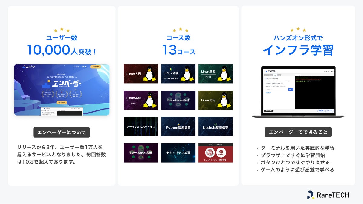 また、RareTECHは、Linuxを学習するツールとして、インフラ学習サイト「エンベーダー」を独自開発致しました。1クリック5秒で、生のLinux環境を立ち上げるツールとしては、日本初のツールです。今回、LPI-Japan様からはエンベーダーをLinuC認定教材にも認定頂いております。RareTECHでは、このエンベーダーを通して、Linuxコマンドやネットワークを学習頂いております。