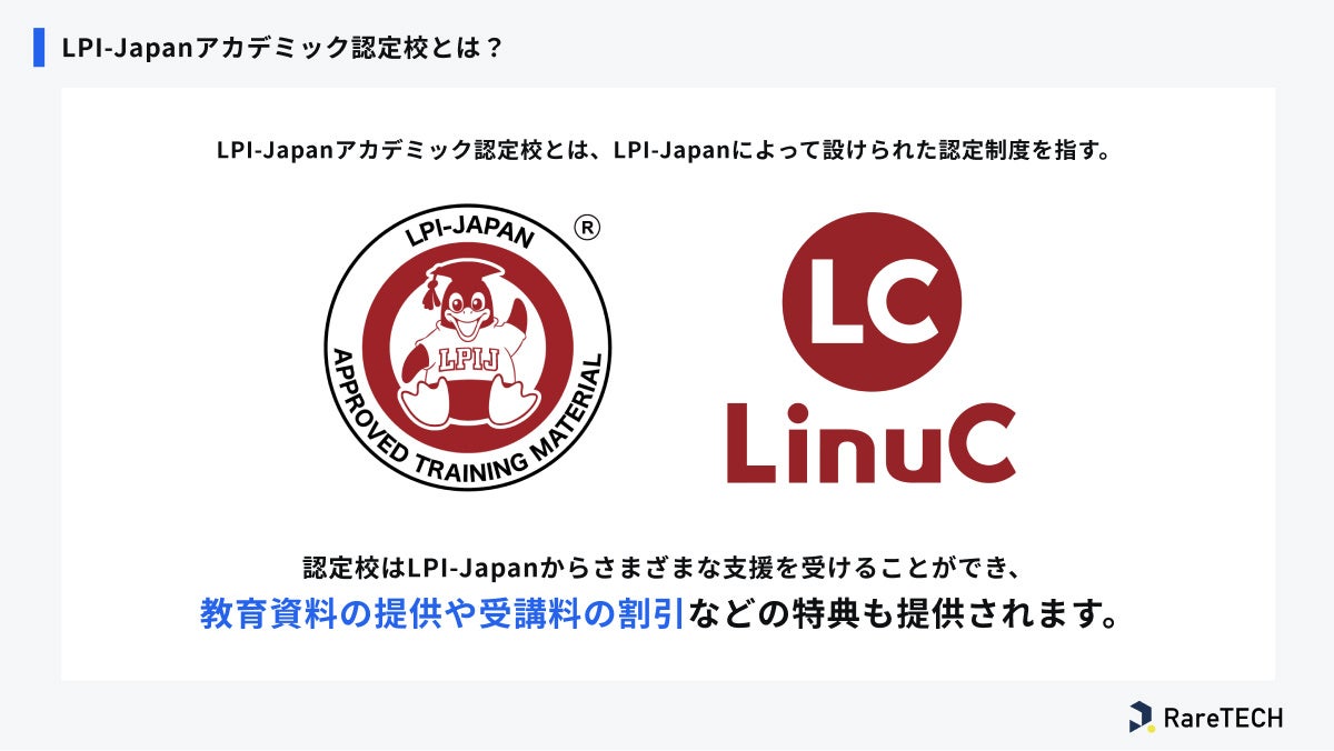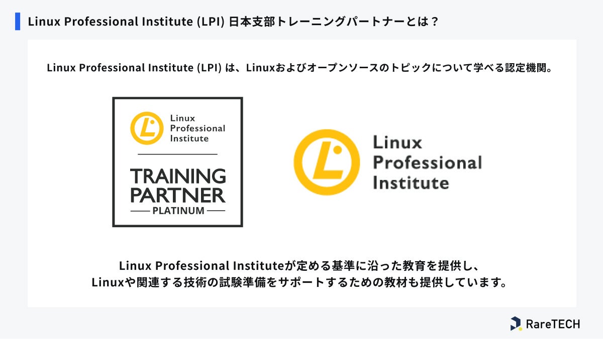 RareTECH(レアテック)は、Linuxをはじめとするインフラ教育への貢献が認められ、LPI-Japan・LPI日本支部の2団体より認定を受けました。
