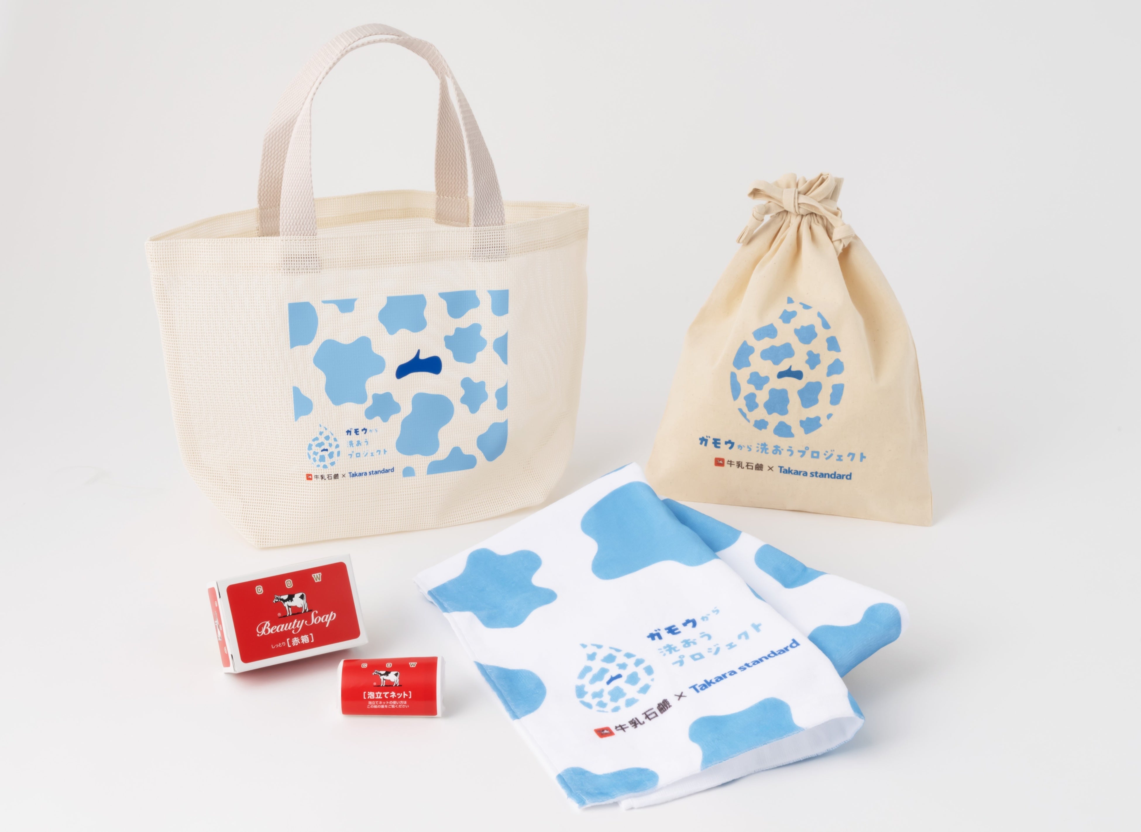 開始日は、「い(1)い(1)は(8)だ」に因んだ1月18日(日)。タカラスタンダードと牛乳石鹸「カウブランド赤箱」、2つのInstagram公式アカウントをフォローした後、それぞれのアカウントの投稿で発表される合言葉を確認し、応募フォームに必要事項を入力して応募された方の中から、抽選で200名さまに「ガモウから洗おうプロジェクト」オリジナルグッズをプレゼントします。今回プレゼントするのは、ウシ柄の中に蒲生エリアの形をさりげなく取り入れたデザインのトートバッグ、フェイスタオル、巾着袋です。さらに「カウブランド赤箱」と泡立てネットも入っており、毎日の洗顔がもっと楽しくなる、今回限りの特別なセットとなっています。