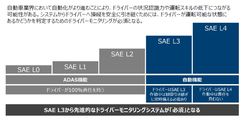 これまでOEM各社ではこれらのシステムを導入する必要がなかったため、同機能に対応しない、あるいはごく基本的なシステムのみを導入する企業が大半でした。しかしながら、新たな要件の導入だけでなく、自動運転レベルの高度化などの影響により、こうした状況は変わろうとしています。適切なドライバーモニタリングソリューションが、より堅牢なSAE L2の実現要因であり、SAE L3における必須条件です。