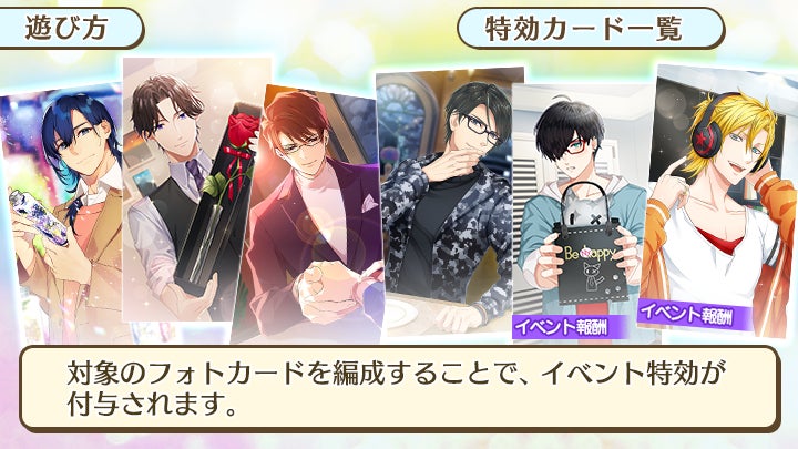 また、イベントと同時開催の「ホワイトデーガチャ」で新登場するSSRフォトカードや当イベント限定のSSRフォトカードを編成することで、イベント特効が付与され、お仕事における活動力がUPします。