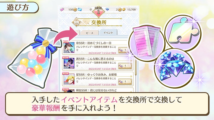 入手した「ホワイトデーキャンディー」は交換所で欲しいアイテムと交換することができます。当イベント限定の藍沢星と久遠郁人のSSRフォトカードや「ジュエル」、「フォトピース(ALL)」などの豪華報酬を手に入れましょう!
