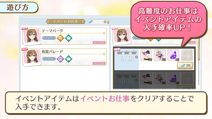 高難度のお仕事は「ホワイトデーキャンディー」の入手確率がUP!育てたフォトカードを編成して高難度のお仕事に挑戦しましょう!
