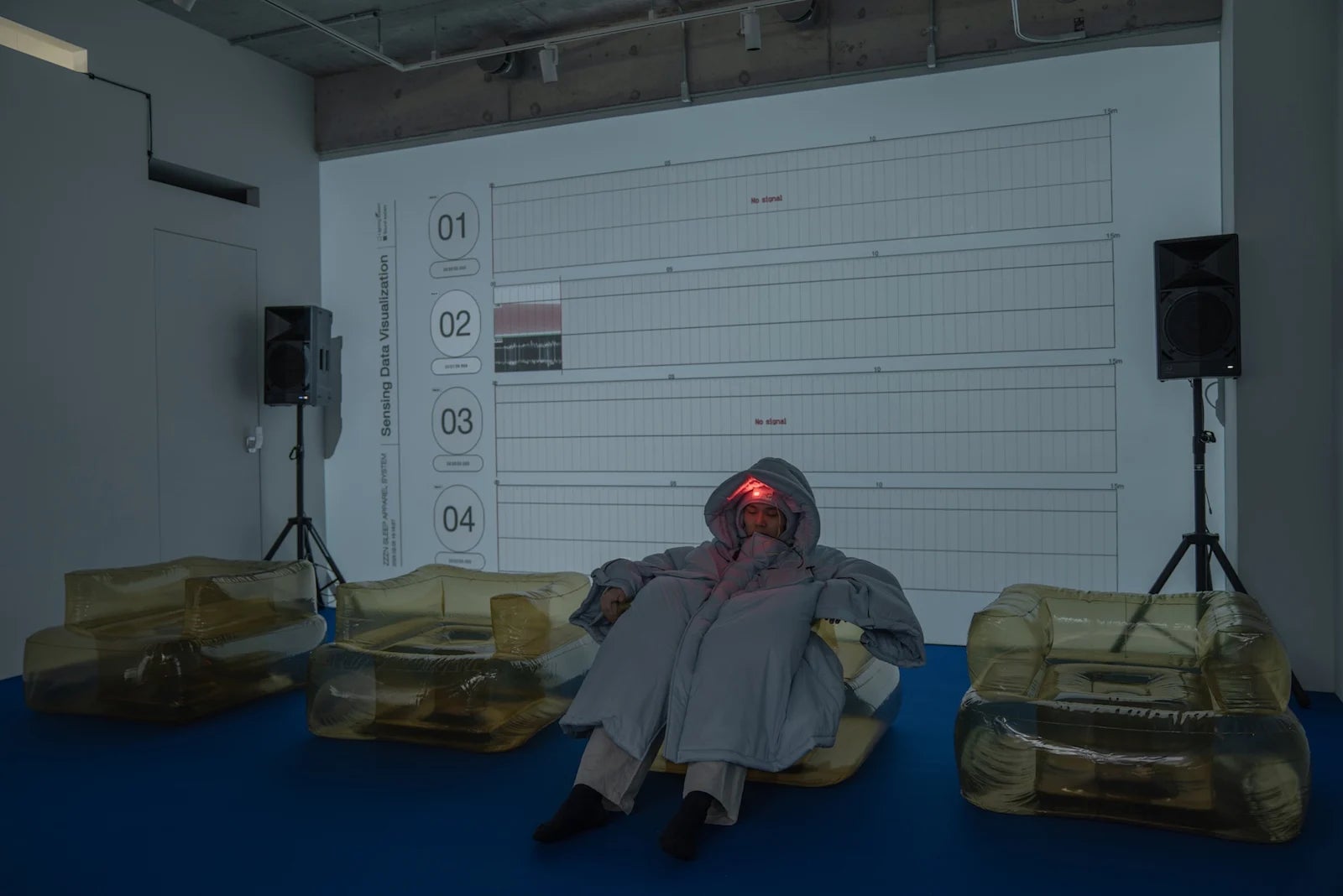 「ZZZN SLEEP APPAREL SYSTEM」は、技術の進歩により24時間365日情報にアクセスできる社会となった現代において、心と身体がオフラインとなる時間の減少に着目し、情報社会との断絶による新たな休息の形をテーマに分眠機能を持つものとなっています。
