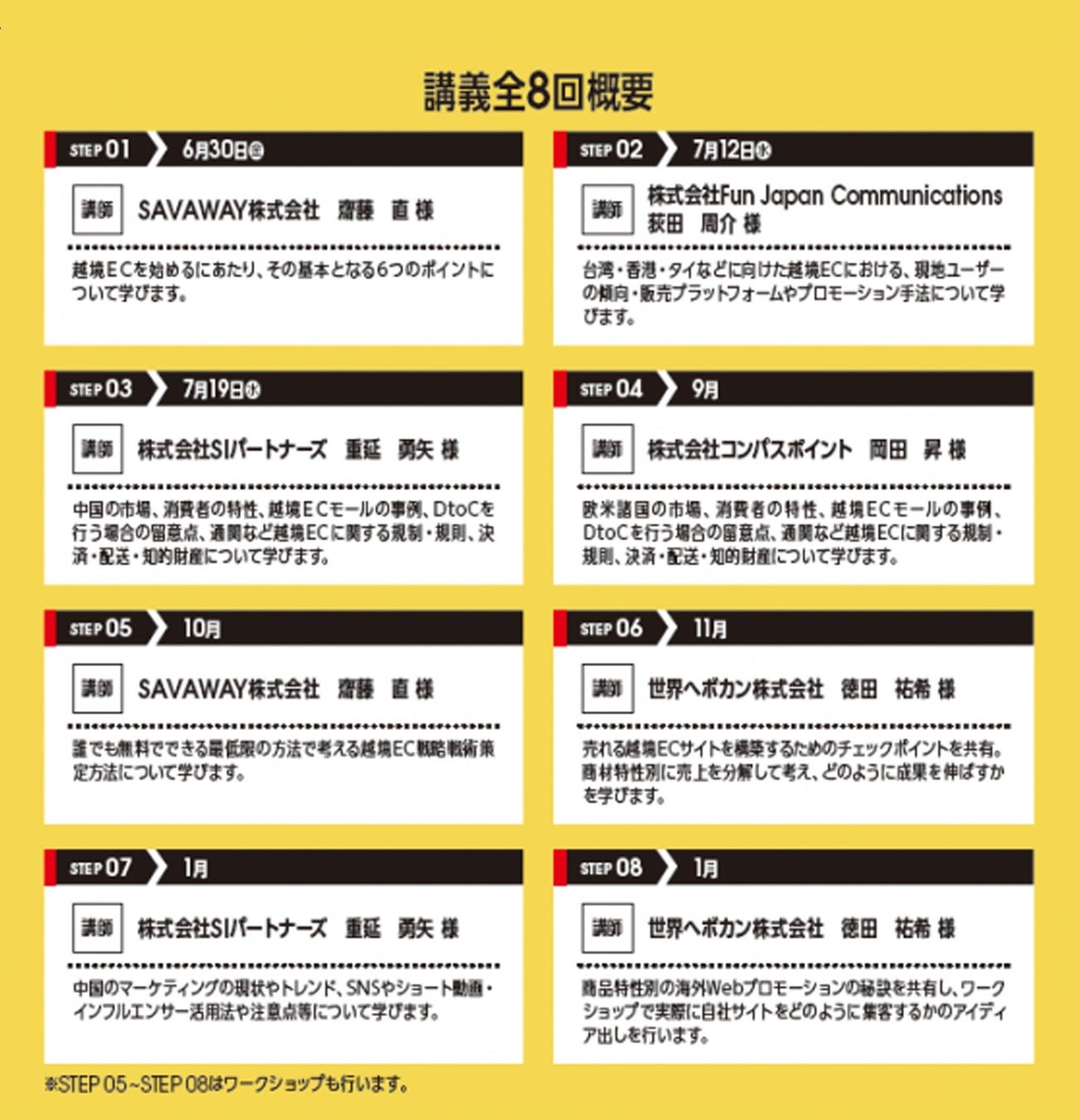 そんな越境EC連続講座ではアジアから欧米までの幅広く網羅し、サイト構築から運営まで全8回のセミナーをご用意。