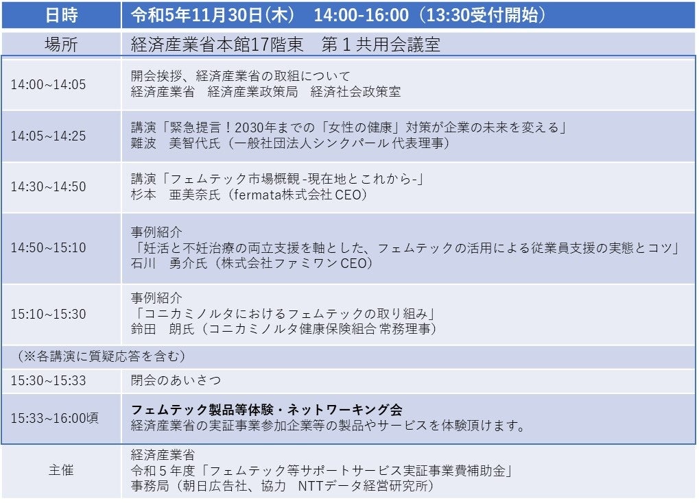 本セミナーでは、企業における女性従業員の健康課題の解決の重要性の理解を促進するとともに、企業様においてフェムテック等製品・サービスを導入される際の課題・ニーズ等について、実際の事例をご紹介します。また、これまで実証事業で採択された実際のフェムテック製品等もご覧頂けます。