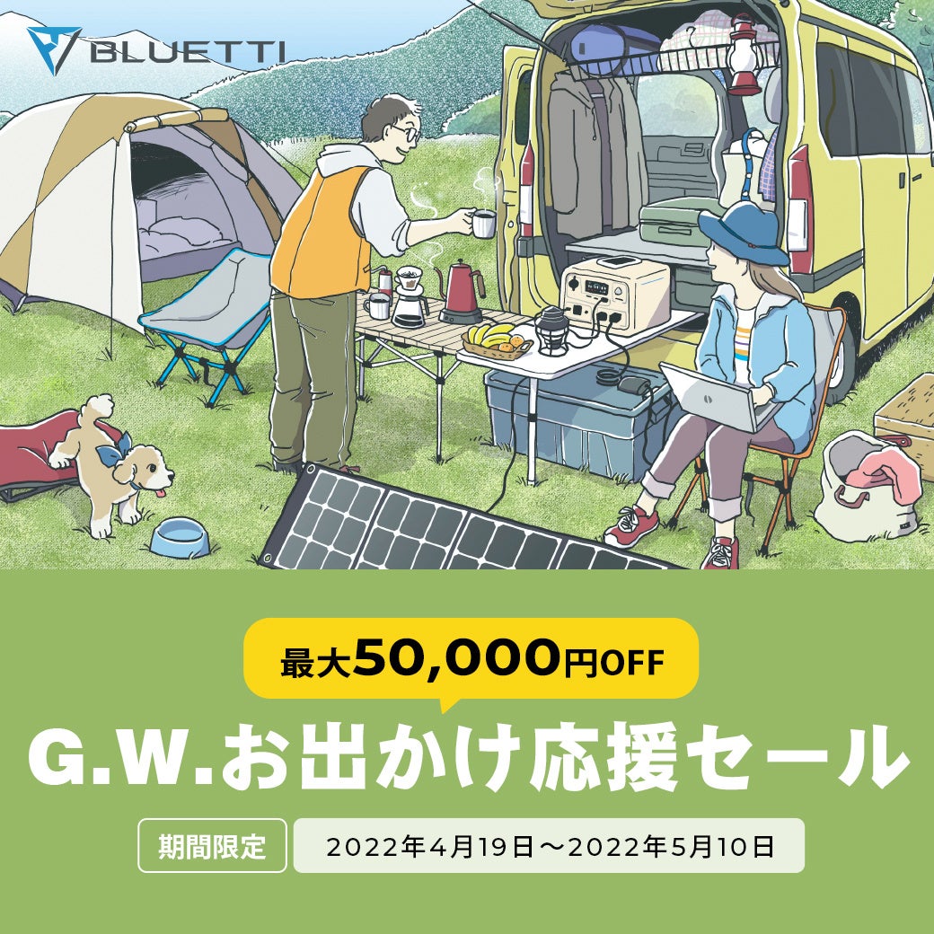 ポータブル電源市場のリーディングカンパニーとして躍進するBLUETTI(ブルーティ)は、ゴールデンウィークの特別キャンペーンを4月19日(火)よりスタートします。ツイッター、インスタグラム、LINEの公式アカウントにてプレゼントキャンペーンを期間限定で実施します。公式ショップ、楽天市場、ヤフーショッピングにて、人気商品が最大50,000円OFFの大特価。