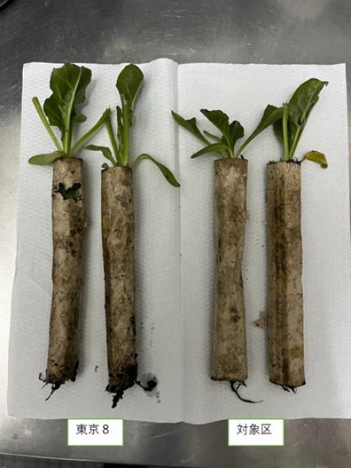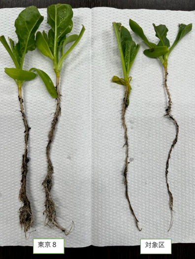 結果として、実験46日目にはその効果が見え始めます。東京8を散布した試験区では、茎の大きさや長さ、葉の大きさが生長著しく、根量(特に細根)が多くなりました。