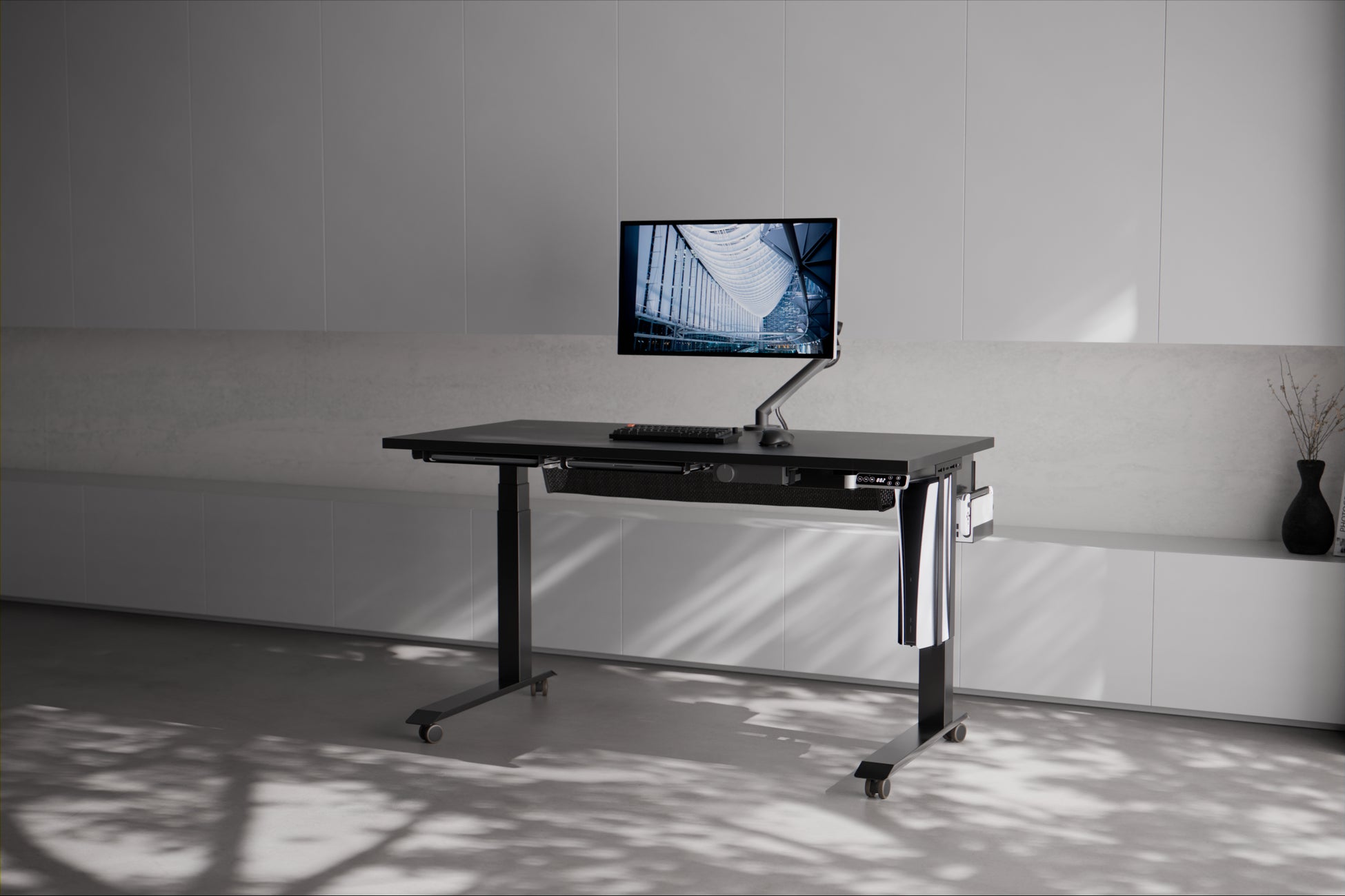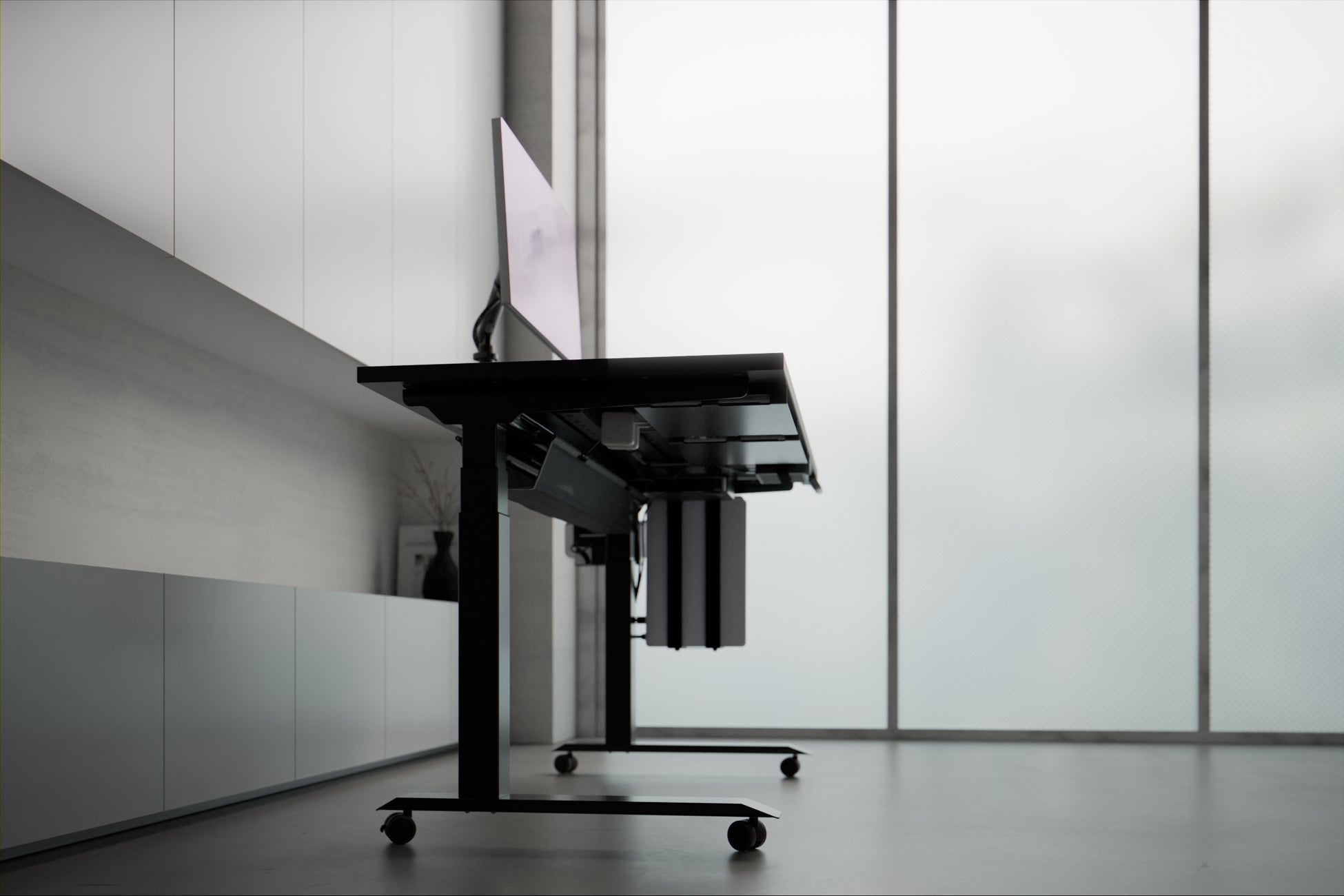 本天板は、FlexiSpotの電動昇降脚・E7 Pro に合わせて開発されました。PREDUCTS DESKの他モデルでは、通常E7/E8のいずれかの電動昇降脚を採用していますが、どちらも支柱が天板の中央にあるモデルです。一方のE7 Proは、支柱が奥側に寄った“コの字型”の形状が特徴のモデル。
