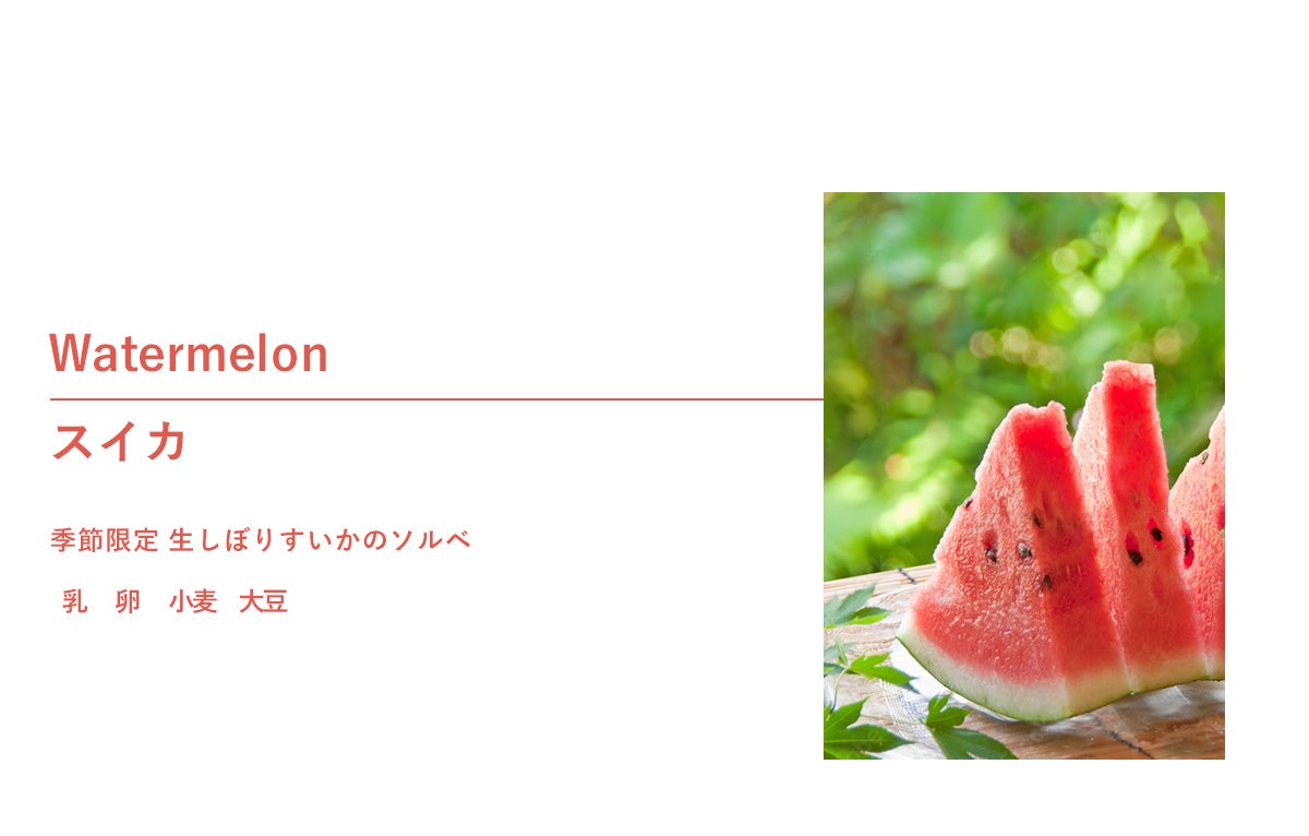 solegeの工房でスイカの果汁を絞り、生果汁を生のまま(非加熱製法)ジェラートにしました。スイカ本来の香りやみずみずしさをお楽しみいただけます。