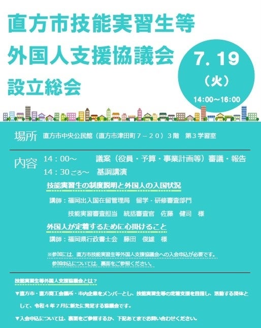 そこで、この度、直方市域におけるこのような諸課題に対応していくため、「直方市技能実習生等外国人支援協議会」を設立することとなりました。