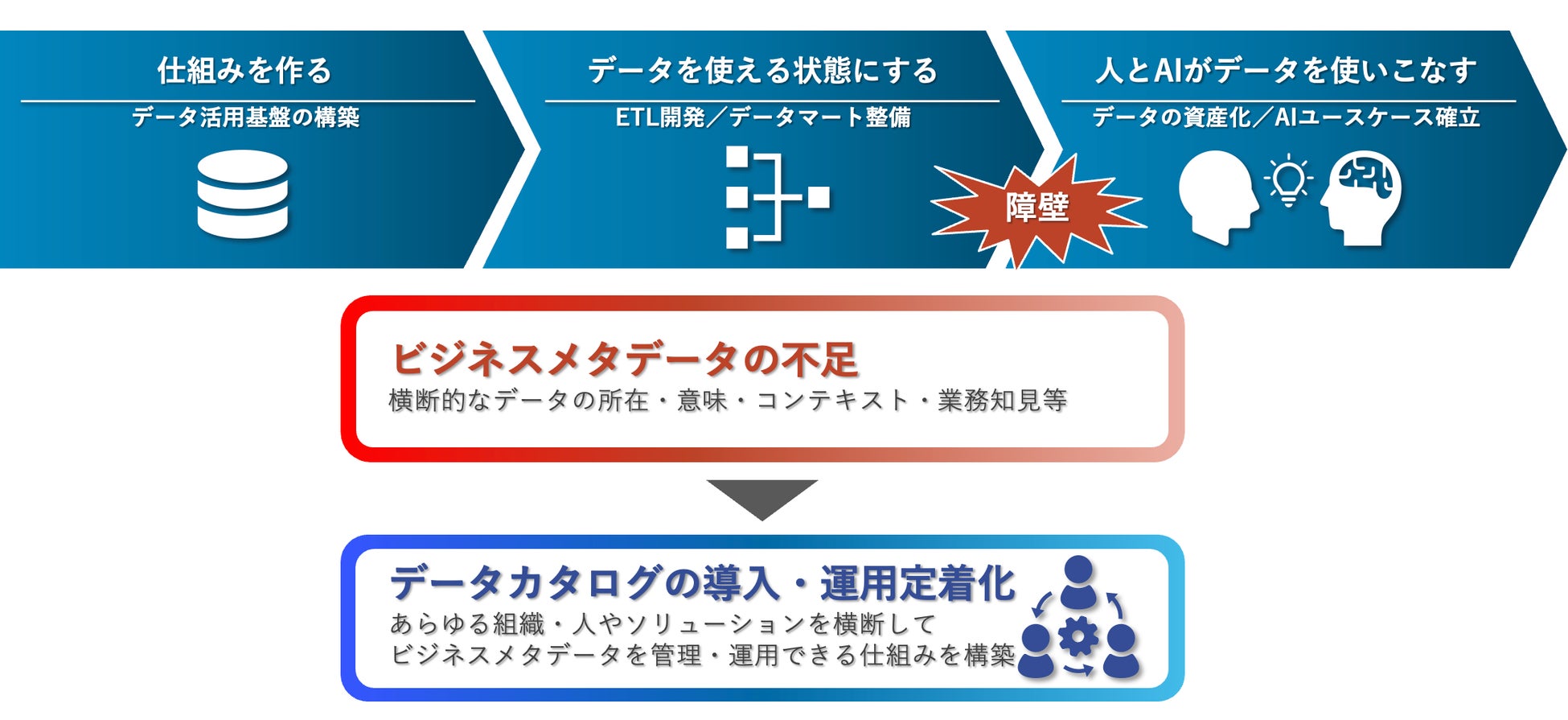 消費者行動の多様化・複雑化および生成AIを始めとした技術の急速な発展に伴い、膨大なデータを活用しスピーディーな意思決定を行うデータドリブン経営が注目されています。その実現には自社が利用するシステム横断で、データの所在、意味、背景(コンテキスト)、データ来歴(データリネージ)注1といったメタデータを整備し、管理・運用することが不可欠です。しかし、データストア注2の多様化、データ量の増加、継続的な整備・管理に係る運用コスト確保などの課題から、データドリブン経営の実現が難航している企業も多く存在します。