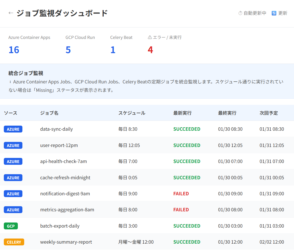 これらのジョブはそれぞれ固有のスケジュール・依存関係・エラー特性を持ち、一つでも停止すればデータ欠損や業務遅延に直結します。