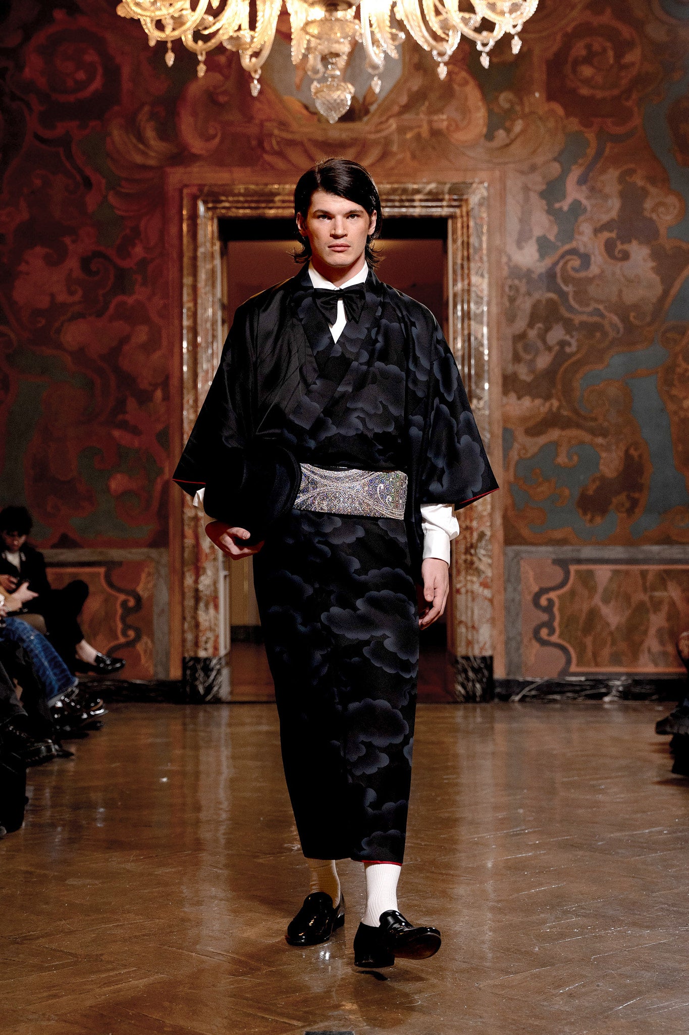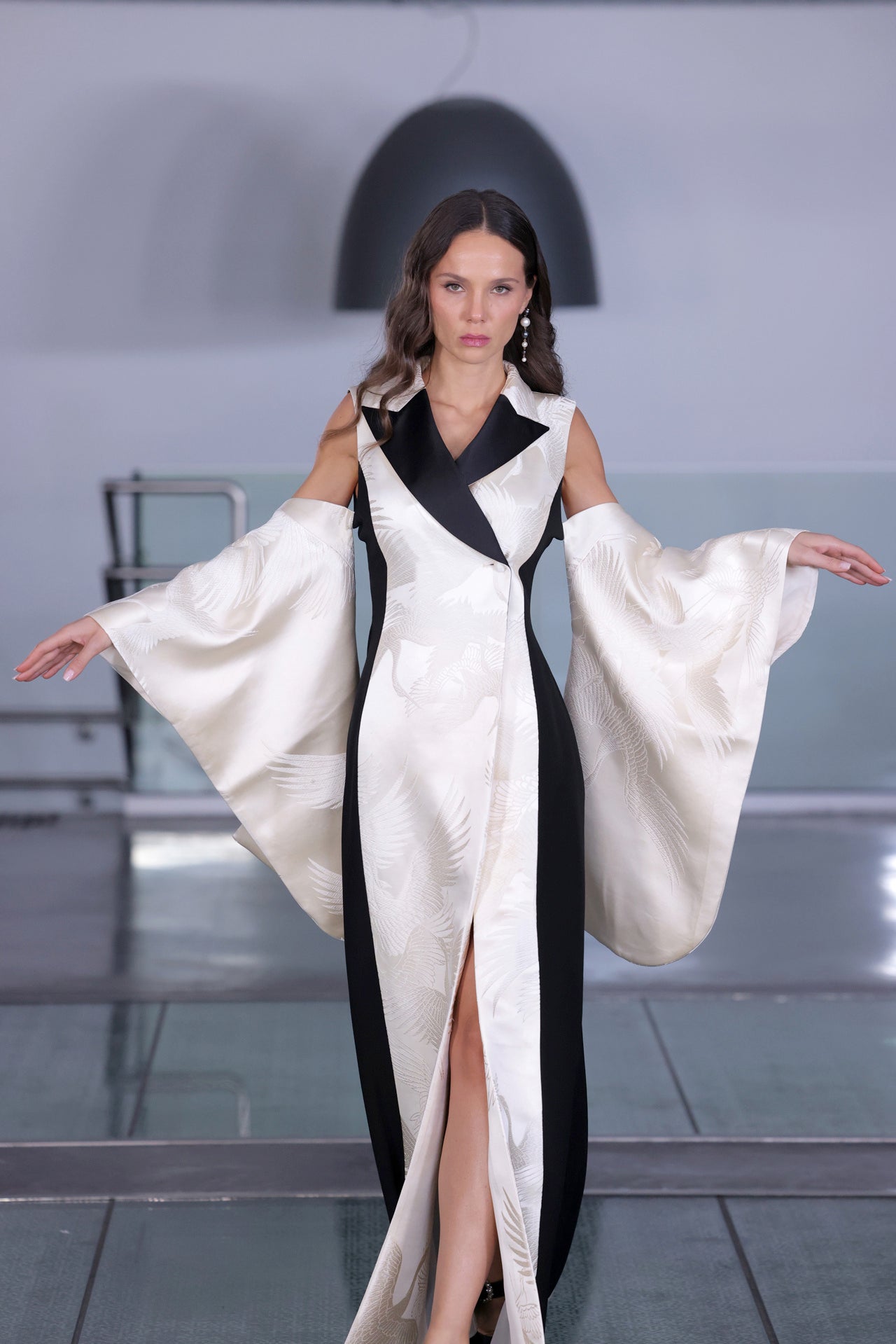 着物地や伝統素材、職人技を活かしながら、国際舞台に通用するシルエットと構築美を追求しています。