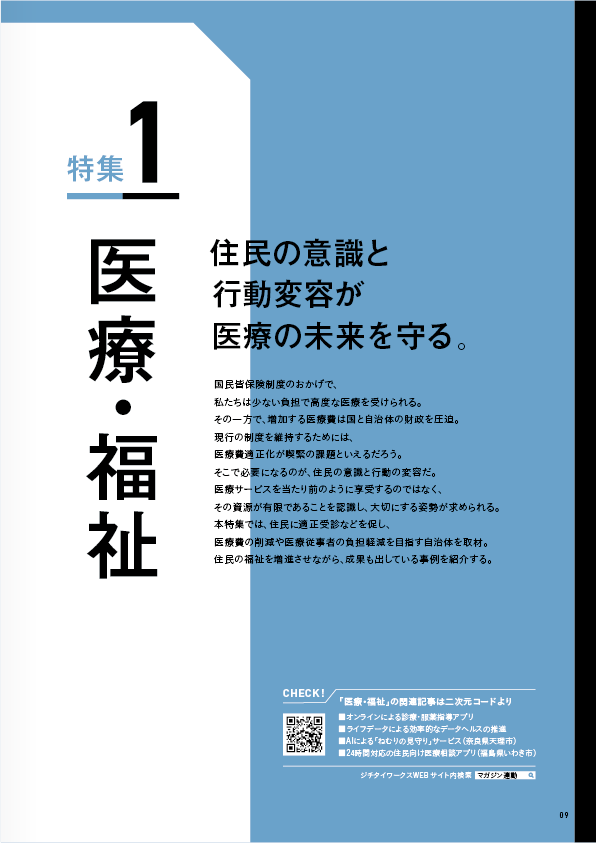国民皆保険制度のおかげで、私たちは少ない負担で高度な医療を受けることができます。その一方で、増加する医療費は国と自治体の財政を圧迫しており、現行の制度を維持するためには、医療費適正化が喫緊の課題といえるでしょう。そこで必要になるのが、住民の意識と行動の変容です。医療サービスを当たり前のように享受するのではなく、その資源が有限であることを認識し、大切にする姿勢が求められます。本特集では、住民に適正受診などを促し、医療費の削減や医療従事者の負担軽減を目指す自治体を取材しました。住民の福祉を増進させながら、成果も出している事例を紹介します。