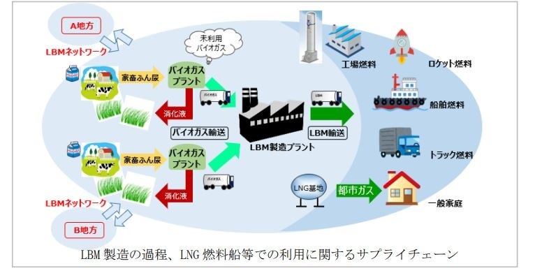 (註1)LBMは、酪農家が保有するバイオガスプラントから発生した未利用バイオガスを回収した後、その主成分であるメタンを分離・精製し、約-160℃で液化したものです。メタンは液化することにより容積を1/600に圧縮できるため、一度に大量のメタンを輸送することが可能になります。また、家畜糞尿が原料のため、カーボンニュートラルな国産エネルギーです。