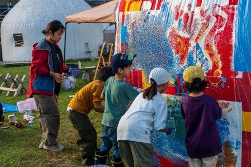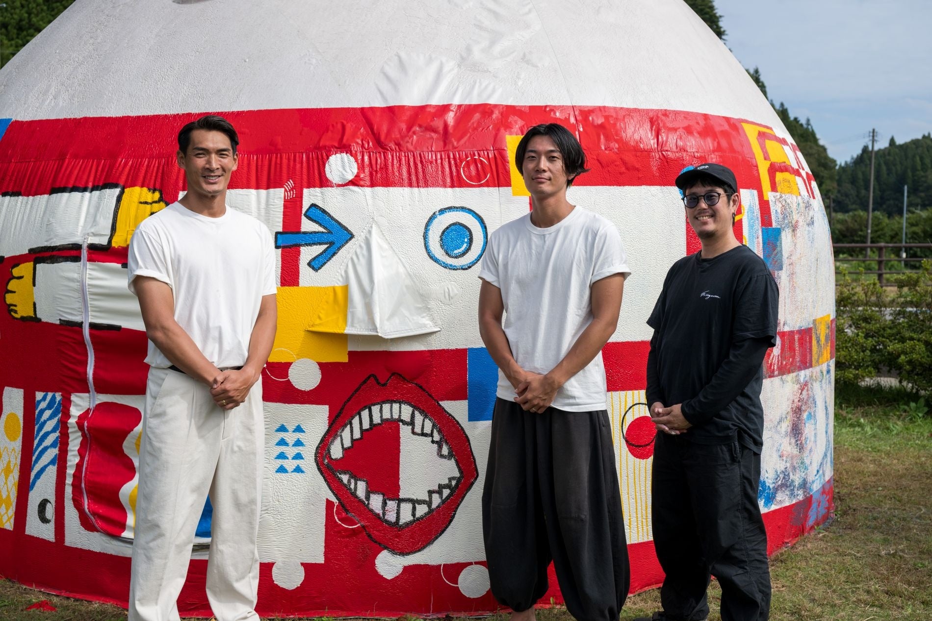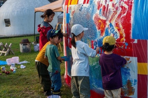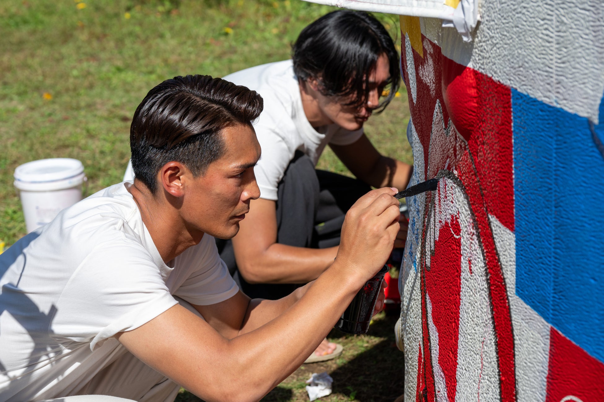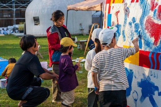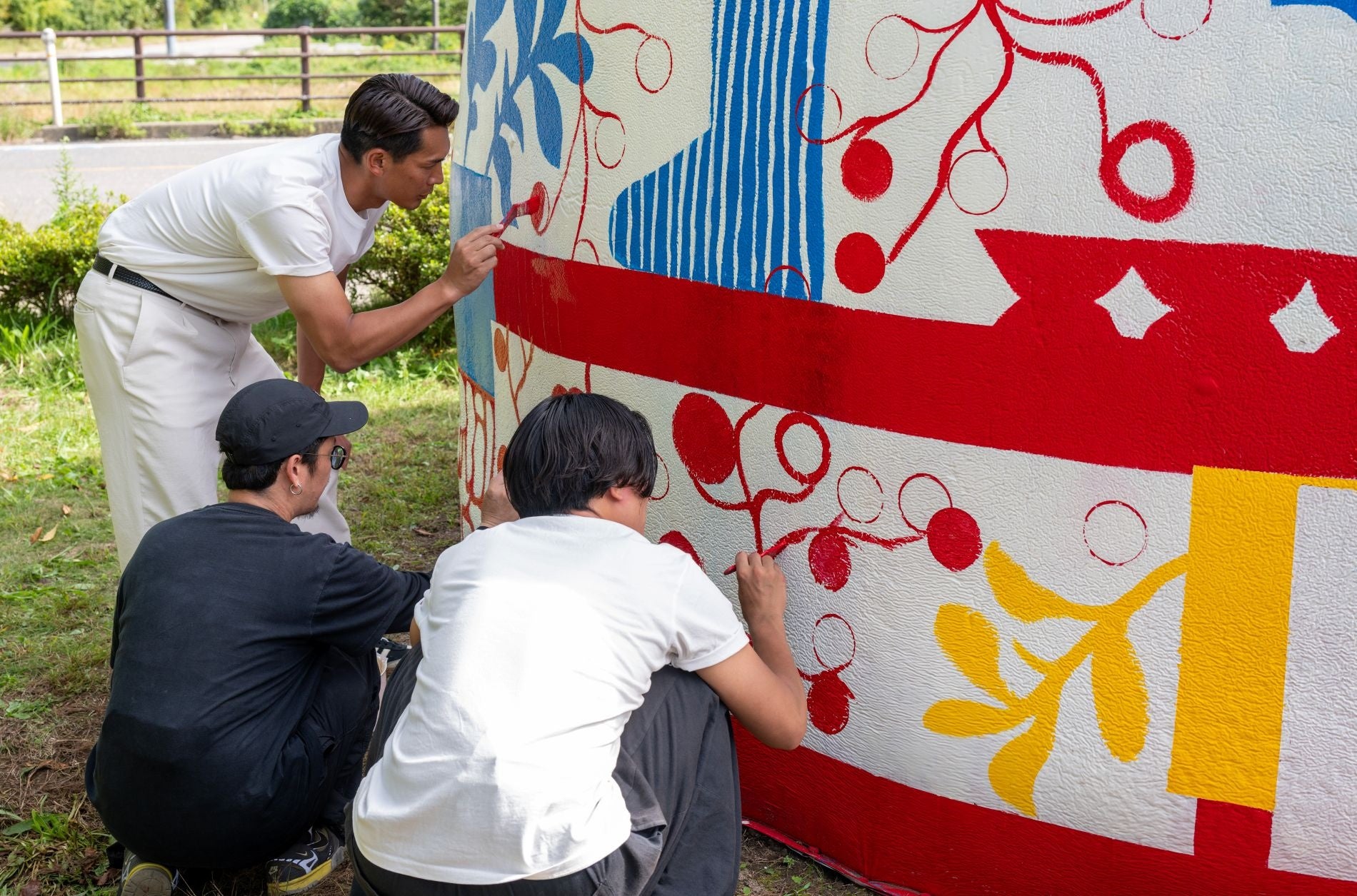 プロジェクトでは、アートを実現するために必要なコーチに、壁画、立体物、デジタルアートなど多岐にわたる表現手法をお持ちのアーティストである田中紳次郎さんを迎え、指導を仰ぎながら奥能登に伝わる農耕儀式「あえのこと」や、輪島の漆文化から着想を得た震災復興の活力となることを目指したメッセージアートで能登の祈り・再生・循環を表現しました。当日はプロジェクトのサポーターである元サッカー日本代表の槙野智章さんも来場し、地域のひととともに完成を支援しました。